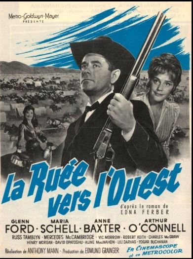 Une longue évocation de la conquête de l'Ouest, avec une mise en scène classique de la part d'Anthony Mann. L'originalité du film consiste dans le fait de suivre une partie de l'histoire d'une petite ville de l'Oklahoma devenue grande, à travers le destin d'un couple. Si vous n'aimez pas les vieux westerns américains, pas la peine de s'engouffrer dedans. Les autres y verront un intérêt, et la présence d'un Glenn Ford plutôt charismatique. "La Ruée vers l'Ouest" présente donc un intérêt dans la compréhension de l'histoire des Etats-Unis, avec ses violences (envers les indiens notamment), et cet appétit de conquête, de même que le sens de la propriété si cher aux américains. Western dont on attendait beaucoup à sa sortie et qui a finalement déçu, l'oeuvre est fort intéressante à redécouvrir. En effet, on retrouve le très grand talent d'Anthony Mann pour mettre en scène des situations, des conflits, des évolutions d'époque... tout cela avec un sens du rythme et d'un certain esthétisme intact. Alors il est vrai que l'on peut ressentir parfois certaines longueurs, et que l'action vient parfois à manquer, mais l'on ne s'ennuie vraiment jamais, et ces petites faiblesses sont compensées sans mal par la réelle réussite des décors, de passage à travers les époques soignées sur fond de plaidoyer (assez discret mais réel) pour la cause indienne. Belle prestation également de Glenn Ford, bien entouré d'excellents seconds rôles, et même si Maria Schell peut paraitre parfois un peu irritante, elle n'en demeure pas moins touchante à plusieurs reprises. Sans être un immense western, La Ruée vers l'Ouest n'en demeure pas moins une assez belle réussite du genre. Voici un très beau western de la part du réalisateur Anthony Mann. Tourné au début des années 60 et avec énormément de moyens, La Ruée vers l'Ouest n'est certes pas le meilleur western de ce metteur en scène, mais possède quelques atouts non négligeable comme le duo Glenn Ford-Maria Schell qui fonctionne d'une bien belle façon et grâce a eux, nous suivons leurs histoire avec intérêt. Certes, il existe certains passages assez longs par moment( surtout vers le milieu du film ), mais l'ensemble de l'oeuvre est tout de même très satisfaisant de la part du metteur en scène de Winchester 73. A noter également, la très jolie partition musicale de Franz Waxman et la belle photographie de Robert Surtees qui apporte un atout supplémentaire bienvenue sur certaines scènes.