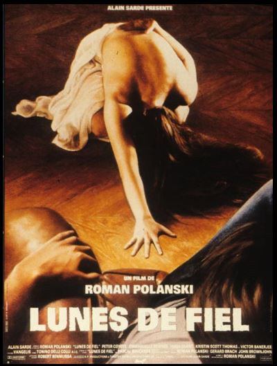 pas ?" C'est tout simplement délectable. Le suspense est remarquablement ménagé jusqu'à un final bluffant. Beaucoup de scénaristes auraient des leçons à prendre avec "Lunes de fiel". Emmanuelle Seigner y incarne la tentation avec un grand "T". Tu m'étonnes que Polanski l'avait épousé en 1989, soit trois ans avant le film. Pas fou le gars. Autre point fort, et peut-être le plus appréciable, les dialogues. Ils sont véritablement ciselés. Ils m'ont rappelé les images de la guerre du Golfe à la télé, quand on voyait les Amerloques balancer leurs missiles SCUD sur l'Irak. Les répliques font mouche à chaque fois. On pourra bien sûr regretter l'esthétique du film, un peu "cheap". On a du mal à croire qu'il a été réalisé dans les années 1990 tellement les images sont laides. Mais bon. C'est du très grand cinéma. Lunes de Fiel s'agit probablement du morceau de cinéma le plus fascinant de son réalisateur, pendant sophistiqué des romans Harlequin, de Barbara Cartland et consorts. C'est le compromis idéal entre cette littérature populaire citée précédemment et les écrits subversifs de Georges Bataille ou de Henry Miller. Justement tiré d'un roman controversé dont l'auteur partage de nombreux points communs avec celui de L'Histoire de l'Oeil et celui de Sexus - à savoir l'exploration des déviances sexuelles les plus inavouables comme moyen d'accéder au plaisir pur - Lunes de Fiel selon Polanski est un film d'une puissance érotique absolument terrible, parcours initiatique transcendé par une Emmanuelle Seigner au sommet de sa beauté. Après une introduction scabreuse empruntant le même chemin périlleux qu'un épisode des Feux de l'Amour les expériences sexuelles relatées par le personnage de Peter Coyote nous sont dévoilées sous la forme d'un important flashback, visions délicieuses rappelant Le Dernier Tango à Paris de Bertolucci... Certes Lunes de Fiel est imparfait, cherche parfois le bon registre, la bonne distance, n'évite pas une certaine platitude lors du dernier quart d'heure mais reste un véritable éveil pour les sens et l'esprit. Troublant, tout simplement.