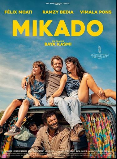 Il arrive que les noms des acteurs présents dans la distribution en disent déjà beaucoup sur la tonalité du long-métrage dans lequel ils apparaissent, presque autant que celui du ou de la cinéaste, qui les a dirigés. Dans le cas de Mikado, de Baya Kasmi, Félix Moati, Vimala Pons et Ramzy Bedia sont au générique. Faut-il attendre de la légèreté, de la poésie, de la fantaisie, voire même un brin de folie ? Pour sûr, et l'émotion sera aussi probablement au rendez-vous. Mikado raconte l'histoire d'une petite famille nomade, roulant en van, obligée de faire escale sur la route, pour un problème mécanique. L'occasion de faire une pause et, peut-être, de mettre à jour quelques frustrations ou malaise plus important. Mikado n'est pas le genre de film où il y a lieu de s'extasier sur la mise en scène ou sur l'originalité de son scénario. En revanche, l'ensemble de la distribution est au diapason d'un récit qui dispense, au fur et à mesure de sa progression, un air de gravité, dès lors que certains sujets y sont abordés. Avec pudeur, globalement, et avec des comédiens qui ne sont pas du genre à tirer la couverture à eux, les enfants y compris. Vu en avant-première avec la présence de Félix Moati, la réalisatrice devait venir mais souffrante. Celui qui m'a bluffé le plus c'est Ramsy, tout en justess, lui qui en fait toujours des tonnes. Le sujet est intéressant mais le film manque un peu de consistance : on ne comprend pas tout. Il y a des flashbacks qui ne font que nous interroger mais ne nous donnent pas de réponses. Ce film n'est pas long mais peut-être aurait-il eu besoin de quelques minutes supplémentaires pour répondre aux questions. Le jeu des acteurs est vraiment bien, notamment les jeunes.