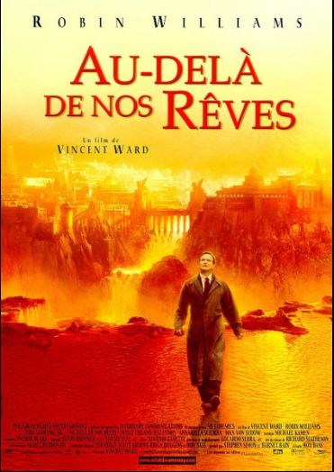 AU-DELA DE NOS RÊVES (1998): Le vie après la mort. Le paradis c'est beau, l'enfer c'est moche. Malgré la présence du regretté Robin Williams, ce voyage vers l'au-delà n'aura rien de séduisant (sauf pour les quelques passages bien colorés). Totalement décroché devant tous ces dialogues lourds et terriblement ennuyeux. Un scénario dépressif, sombre, rien de plus normal face à cette douleur d'une famille remplie d'amour mais si vite détruite. Cette histoire très trainante cherchera à atteindre nos émotions, désolé cela ne fonctionnera pas, son rythme sera beaucoup trop soporifique. Un film pesant. Un film bien étrange et assez mystique. Je reconnais que les effets visuels sont trés bien faits mais je reste perplexe sur l'intrigue du scénario qui me parrait tirée par les cheveux. Une thése de la vie aprés la mort est sans fondement et relativement farfelue. Renoncer au paradis par amour pour aller vivre en enfer pour rester avec celle que l'on aime est une pure connerie. Quand on veut s'attaquer à ce genre de sujet, il ne faut pas viser son point de vue mais plutôt avoir une vision globale.