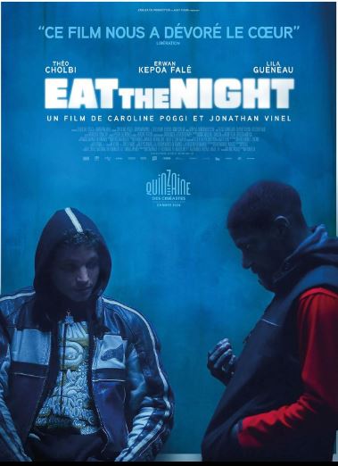 Il y a dans eat the night de très belles idées de cinéma, la représentation du monde virtuel comme d'un espace sensible, une histoire d'amour charnel qui sort des sentiers battus et une manière de filmer l'adolescence dans ce qu'elle a de plus naïve et brutale à la fois. Eat the night est sans doute un peu régressif, trop proches de ses personnages qui agissent avec colère sans réfléchir, instinctivement mais, en même temps, c'est ce côté pulsionnel qui donne sa force au film. Le côté histoire de gangs manque un peu de maîtrise comme s'il fallait à tout prix montrer la cruauté et les difficultés du réel en miroir à l'espace idéal du jeu. Eat the night est souvent touchant, parfois même fascinant qu'on en oublie les quelques maladresses. Sans doute la naissance de deux jeunes réalisateurs talentueux qui se sont jusque là surtout fait connaître grâce à leurs courts-métrages. A découvrir. "Eat the Night" en compétition au festival de Cannes cette année (Quinzaine des cinéastes) est un thriller dramatique qui se regarde. En effet les réalisateurs Jonathan Vinel & Caroline Poggi livre aux spectateurs une histoire originale abordant le thème de l'amour au masculin, de la fin de l'adolescence, de la guerre des gangs et des jeux vidéo avec un trio de jeunes acteurs qui marchent bien dommage que le film fait sans cesse des allers-retours entre le monde virtuel et réel nettement mieux exploité selon moi, c'est dommage car au final cela donne un scénario parfois maladroit et bancal faisant perdre l'intérêt pour l'histoire. À la base, les idées sont bonnes : la toile de fond s’appelle "Darknoon", le jeu vidéo dont se sont nourrit Pablo et sa soeur Apo pour s’évader d’un quotidien que l’on comprend pas très fun ; une très belle histoire d’amour entre Pablo et Night (Chaud ! Chaud ! Chaud ) ; une guerre de territoire de stupéfiants. À la base, les acteurs sont crédibles : Théo Cholbi qui ne passe jamais inaperçu est très bon 👍 et va j’espère, grâce à ce rôle, être un peu plus visible sur nos grands écrans (Je l’avais déjà remarqué dans The Smell of Us, Marguerite, Réparer les vivants, La nuit du 12), Lila Gueneau fait le taf et Erwan Kepoa Falé séduit à chaque apparition. L’image est très soignée (heureusement car tout le film parle d’un RPG, exit la partie de ping-pong de Nintendo! 🤣) et l’ensemble est très rythmé… L’ensemble est très rythmé… pour poser ce décor… car après j’ai un peu décroché, voire beaucoup (Certains ont même quitté la salle) ! Après donc, j’ai eu l’impression que les réalisateurs, qui se présentent dans la bande annonce très accrocheuse comme "Visionnaires" (N’ayons pas peur pour leurs chevilles) ne savaient plus quoi faire de cette histoire ! Un peu comme les dès d’un Booggle que l’on découvre en toute perplexité… Je ne vous révèlerai pas la fin mais le film est catégorisé en "Drame, Thriller". Ce n’est donc pas le film de l’année (car en général il sort octobre), je n’en garderai pas un souvenir impérissable mais l’adrénaline qu’il dégage ne me fait pas regretter de l’avoir vu au cinoche.