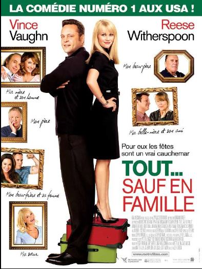 fatiques, etc... Cela commence plutôt bien : piquant et présentant un discours assez moderne voire provocateur pour une comédie américaine, « Tout... sauf en famille » laisse augurer quelques espoirs... ou pas. Car on se doute bien que tout ça ne va pas durer et ce petit monde rentrer dans le rang concernant les valeurs de la famille, même si on pouvait s'attendre à pire. C'est parfois bien lourd, mais plutôt rigolo par moments, notamment dans la façon de n'idéaliser personne, quitte à rendre de temps en temps nos deux héros (surtout lui) assez gonflants. On est presque dans le film à sketchs, mais il y a une relative cohérence d'ensemble, d'autant que Seth Gordon a le mérite de faire court. Que rajouter de plus, si ce n'est que malgré un aspect répétitif et un gros passage à vide venant alourdir la dimension conservatrice de l'œuvre (à noter toutefois une fin ayant le mérite de ne pas trop en rajouter), cela se regarde sans déplaisir, avec quelques bonnes idées et un sympathique défilé de stars « seniors » (Robert Duvall, Mary Steenburgen, Sissy Spacek, Jon Voight). Dispensable donc, mais pas insoutenable non plus. Désormais, on le sait tous, la comédie de Noël est un genre en soi aux USA. Celui-là est porté par un casting assez riche comprenant V. Vaughn, J. Favreau, R. Duvall ou encore R. Witherspoon. Au début, la présentation du couple est sympa, ce dernier essayant de vivre comme il l'entend, loin de tous les carcans et diktats que lui imposent notre société moderne. On comprend donc que cette vision va (hélas) évoluée. Il y a pas mal de scènes marrantes, des personnages plus ou moins mémorables et un discours sur le couple certes convenu et dans l'air du temps mais asséné sans trop de lourdeur. J'ai pas mal ri, je me suis parfois senti un peu en dehors du film mais dans l'ensemble, c'est assez respectable, grâce à l'abattage de V. Vaughn.