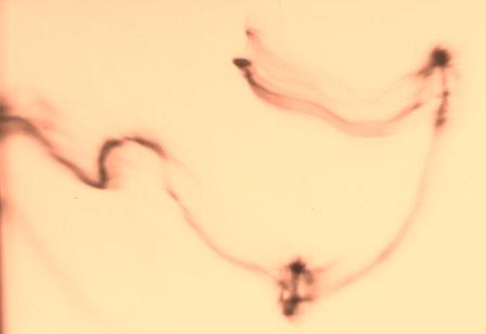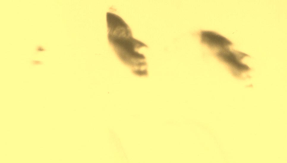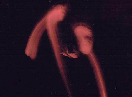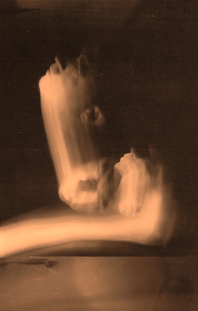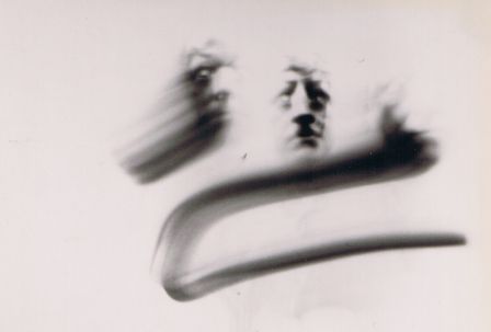 | ...Ici, il s'agit donc toujours de la série des autoportraits au sténopé (curieusement initiée au Louvre-cf. maldorscopie-p6) dit aussi à la "boîte à chaussures" . En réalité, Maldor n'utilise pas à proprement parler une telle boîte car il a trouvé un support moins encombrant, n'ayant gardé en quelque sorte que le "trou d'aiguille" puisque c'est l'essence de ce procédé (très ancien) à la fois minimaliste et maximaliste, car pouvant plus ou moins tout enregistrer, associant un peu si on veut photo et cinématographie puis qu'il peut garder en mémoire le mouvement. En effet, l'image ci-dessus, par exemple, a été obtenue en une seule fois (il n'y pas de surimpression ou autre...) par l'effet de la "pose dynamique" (ou dynamisée) qui consiste pour Maldor à évoluer devant l'appareil en pensant à la trace que son seul visage éclairé dans le noir pourra laisser sur l'émulsion...(Ou la façon inimitable qu'il a de faire de sa propre tête une sorte de pinceau virtuel dont il maîtrise alors d'une façon étonnante les effets picturants et dessinants qui ne seront révélés qu'après coup par le développement...) |