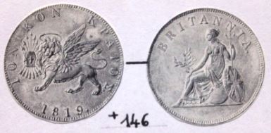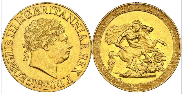 (George III) Souverain (or à 0.916) ( 22 mm - 8g ) (n°285) Abandon du bi-métallisme : l'or étalon unique. Les anciennes pièces d'argt + les dollars espagnols(8 réaux) contremarqués sont retirés. La guinée (21 shill.) remplacée par le souverain d'or (ou livre)(n°285). En argt, couronne (crown) de 5 shill., 1/2, shill. et 6-pence. Les pièces de 3 et 4 pence (groat) remises en circulation. Sur le souverain et la cour., type de rev. splendide par un graveur italien : St-Georges et le dragon. Mais ces pièces ne deviendront courantes que sous Victoria (1844).