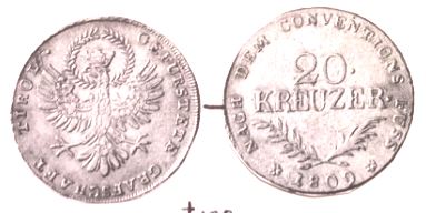 1811 20-kreuzer (ar) ( 28mm - 7g ) (n°281) AUTRICHE-HONGRIE (Empire, François Ier) Réapparition du monnayage métallique sur la base de la Convention de 1753. En or, 4 et 1 ducats ( Portrait / Aigle à 2 têtes ). En argent, thaler de Convention et 1/2 + 20 (n°281), 10, 5 et 3 kreuzer. PORTUGAL (Jean VI régent) L'effigie royale est adoptée aussi pour le bronze.