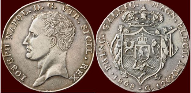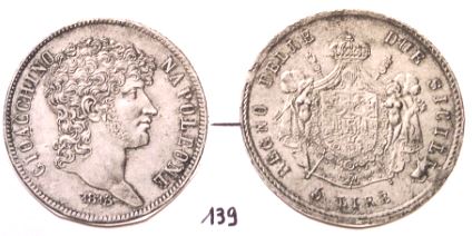 1812-1813 5-lire (piastre) (ar) ( 37mm - 27g ) (n°282) NAPLES (Roy. Joachim Murat, beau-frère de Napoléon) Système antérieur d'abord inchangé (sauf effigie et légende) avec piastre de 12 carlini - 120 grana. Puis (1810) syst. décim. avec 1 franco puis 1 lira de 100 centesimi. Abondante variété de valeurs pour des pièces (or, argt, cu) parmi les plus belles de la période napoléonienne (n°282). DANEMARK Réforme, nouvelle u.m. le "rigsbankdaler" val.6 marks 16 skillings pour le Dan. et la Norv. et 30 shillings pour les 2 duchés allemands Schlewig-Holstein.