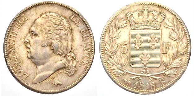 1814 5-Francs (ar) ( 37mm - 25g )(n°283) FRANCE (Louis XVIII ou Restauration) L'effigie du roi remplace celle de Napoléon pour des monnaies en continuité (l'écu royal reprenant sa place au rev.) En or 40 et 20fr, en argent de 5fr (n°283) à 1/4 fr. NORVEGE Jusque-là, intégration totale au syst. danois (lion au rev.), désormais sous tutelle suédoise avec plus de liberté, lion au rev. de toutes les pièces et légendes en norvégien. ESPAGNE Les Français expulsés. Nbses nécessités ou de siège durant la guerre de l'Indépendance. (Gérone, Lérida, Tarragone, Tortosa et Baléares). |