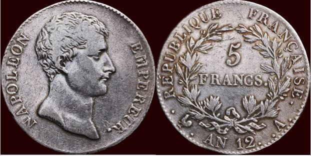 (Napoléon Bonaparte) 5-francs (ar à 0.900) ( 36mm - 25g ) (n°273) Les réformes de la Convention (1792-95) et du Directoire (1795-99) furent codifiées par Bonaparte : par la loi du 17 germinal (avril) an XI, le franc (dit "germinal") est rattaché à la fois à l'or et à l'argent. Pour ce dernier sans changement (5.00g à 0.900) val. 1 livre. Vis à vis de l'or le franc était de 0.290g de fin (ratio de 15 1/2 entre les deux métaux). Les pièces étaient de 40 et 20 francs pour l'or et de 5 (n°273), 2, 1, 1/2 et 1/4 de fr. pour l'argt. Les assignats sont démonétisés. Le franc germinal influencera les systèmes étrangers : P-B, Belgique, Italie, Balkans. Fondation de la Banque de France qui a le monopole des émissions monétaires. |