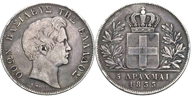 1832-1833 5-drachmes (ar) ( 38mm - 22g )(n°293) 1832 RUSSIE (Nicolas I) Aigle rapetissé pour faire place aux écussons des six états constituants + val. en ttes lettres "moneta pybl" (rouble) ou "moneta poltina" (1/2 r.) 1833 GRÈCE (Prince Otto de Bavière, roi) La monnaie d'Egine fermée en 1832, le nouveau monnayage fut frappé à Münich et à Paris. Le phénix est remplacé par la drachme : 20 et 40 dr. en or, 5 (n°293), 1, 1/2 et 1/4 dr. en argt et 1, 2, 5 et 10 lepta de cuivre.