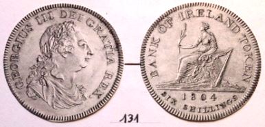 1805 6-shillings (cu) (token) ( 40mm ) (n°275) IRLANDE Monnayage anglo-irlandais proche de celui de l'Angleterre : Emission de tokens 6-shillings (n°275) + 1/2 et 1/4 penny de cuivre pour stabiliser la petite monnaie. PORTUGAL Du papier-monnaie est émis par la Banque de Lisbonne pour rembourser les bons, mais qui n'aura cours légal qu'en 1846. (Le taux des bons avait été diminué et parfois même annulé).