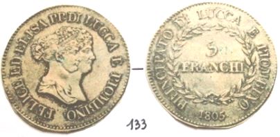 1805-1806 5-franchi (ar) ( 38 mm ) (n°276) 1805 ITALIE (Roy. napoléonien) Système à l'image du syst. français pour un large éventail de pièces (frappées à Bologne, Milan et Venise) avec pour u.m. la lira de 100 centisimi + Principauté de Lucques et Piombino (sa soeur Elisa) u.m. le franco de 100 cent. , 1 et 5 franchi d'argent (n°276) et en cu, 5 et 3 centisimi. 1806 FRANCE (Napoléon) Abandon de la datation de l'ère révolutionnaire(dernière "an XIV") Retour à l'ère chrétienne.