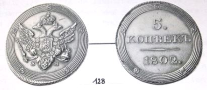 RUSSIE (Alexandre Ier) 5-kopecks (cu) ( 42 mm ) (n°272) 1801 Double-Aigle rétabli comme type d'avers sur l'or, l'argt et le cuivre (n°272-g). Toujours le bimetallisme argt / cu . L'or esr émis irrégulièrement (10 et 5 roubles). Des frappes de ducats hollandais se poursuivent pour le commerce extér. , finissant par circuler en Russie même. 1802 En cuivre, 5, 2 et 1 kopeck, denga (1/2 k.) et polushka (1/4 k.). Types similaires à l'argt mais conservant leur listel caractéristique à globules (tradition byzantine) (n°272). |