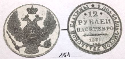 1828 12-roubles (pl) ( 33 mm )(n°290) RUSSIE Introduction du platine (mines de l'Oural) 12(n°290), 6 et 3 roubles, basé sur un système duodécimal (en raison du rapport platine / argent et des dimensions et du poids des flans des 1, 1/2 et 1/4 roubles utilisés pour frapper le platine. SUISSE (Conf. helvét.) Les billons de la Rép. Helv. (1798) sont retirés peu à peu.