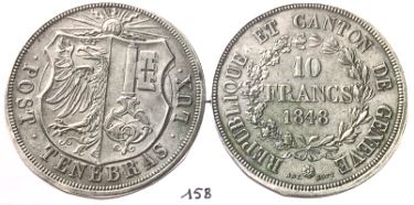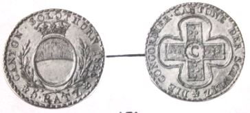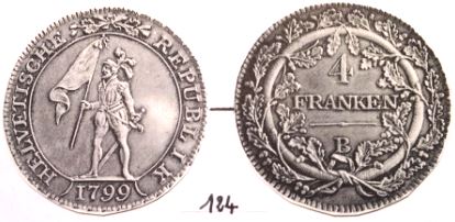 Helvét.) 4-franken (ar) ( 38 mm ) (n°271) Les 13 cantons formaient une confédération complexe et instable sans véritable autorité centrale et avec plusieurs systèmes monétaires : Berne thaler de 40 batzen, Zürich de 72 schillings et Bellinzona en conformité avec l'Italie. En Avril les forces napoléon. unifient les cantons en un état centralisé, le droit de monnaie devenant le privilège du gouvernement central. Le système, dérivé du syst. bernois, a pour u.m. le franc suisse de 10 batzen ou 100 rappen. Le thaler de 40-batz. valant 4-franken (n°271) . En or : 32 et 16-franken (duplone). En argt : 40, 20 et 10 batzen. En billon, batzen et rappen. |