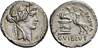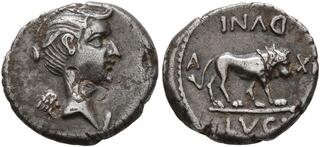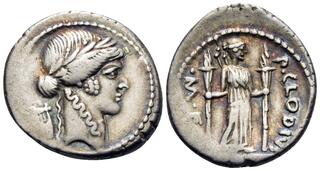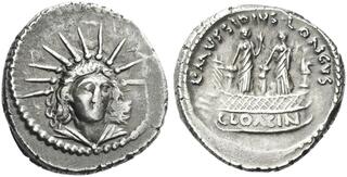 44-28 av Tête de Sol, au revers 2 statues de Vénus Cloacina ("des égouts") dont le sanctuaire sur le forum se situait à l'entrée de la "Cloaca Maxima" (le grand égout de Rome) (42av) (n°128)