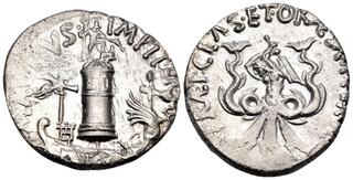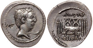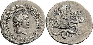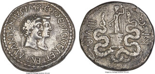 44-28av Tête de Marc Antoine / Ciste mystique entourée de serpents et surmontée d'un buste de sa femme Octavie. (39av) (n°146) Cette pièce frappée par M.Antoine en Asie Mineure copiée sur une espèce locale courante nommée "cistophore" , de la valeur d'un tétradrachme et donc plus grande et plus lourde que le denier (27mm-12g).