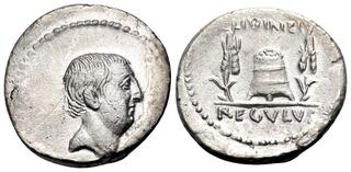 44-28 av Tête du préteur L.Regulus / Modius (mesure à grains) entre deux épis de blé. (42av) (n°130)