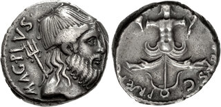 44-28av Tête de Pompée le Grand / Neptune entouré d'Anapias et d'Amphinomus portant leurs parents sur leurs épaules. (42av) (n°131) (Denier de Sextus Pompée, général romain et plus jeune fils de Pompée le Grand).