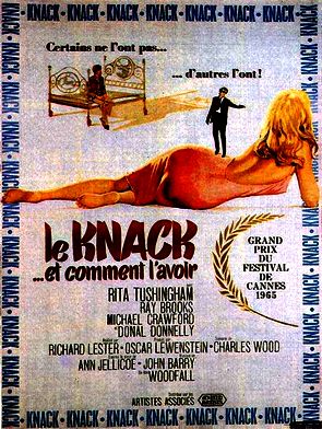 - "Le Knack" -(Richard Lester)-(1964) Comédie Films notables : Wonderwall(1968), Les chemins de Katmandou(1969) Les diablesses(1972), La course à l'échalotte(1974), Mort sur le Nil(1978)La fille prodigue(1980), Circulez y a rien à voir(1983), Le garde du corps(1983), La femme de ma vie(1986), La belle noiseuse(1990), Noir comme le souvenir(1994)... |
