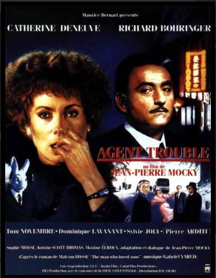de Gabriel Yared qui colle parfaitement au film, Très bon film. Même Bohringer est crédible (avec une petite moustache à la Dario Moreno). J'y vois la version Mocky de "Psycho", dans la mesure où l'on n'arrête pas l'adversaire dans sa course, avant que le mal soit fait, toujours irrémédiable. Un bon polar français signé Jean Pierre Mocky, mettant en scène une histoire très intéressante et très bien racontée. Le casting est de qualité, on y retrouve notamment Catherine Deneuve, Richard Bohringer, Pierre Arditi, Dominique Lavanant... "Agent Trouble" est un film policier a l'intrigue bien entretenue et charmant de par le fait qu'il est bien imbibé du style de Jean Pierre Mocky, dans le cité immoral, dans les dialogues, dans les personnages... Pas un grand Mocky, mais un film de qualité tout de même. Un Mocky se regarde comme un Mocky, un point c'est tout. Il ne faut pas chercher à comparer cette icone du cinéma français avec un autre cinéaste. Certes ce film est décalé, bizarroïde, mais encore une fois c'est du Mocky !!! Cette histoire pas du tout crédible est fidèlement adaptée du roman de Malcolm Bosse L'HOMME QUI AIMAIT LES ZOOS, j'ai rarement vu une série noire aussi bien adaptée. Mention spéciale à Richard Bohringer en barbouze attachante, avec ce personnage de jeune femme amoureuse de lui - élément assez inattendu concernant un personnage de tueur implacable pour le compte du gouvernement. Du moins c'est que l'on suppose. Une histoire rêvée pour le cinéaste qui profite de cette histoire de Raison d'Etat pour s'en prendre une fois de plus aux institutions, aux mages de l'ombre, ces seigneurs de l'invisible qui décident du sort de leurs concitoyens.