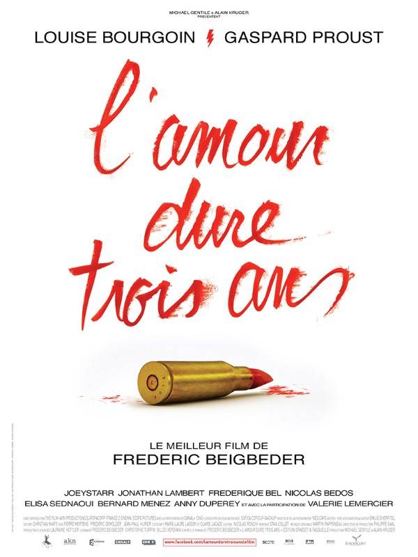 Cette comédie débridée, écrite et réalisée par Frédéric Beigbeder, nous offre une très belle photographie et une excellente bande musicale ; dommage que le rythme lent et la mise en scène trop molle viennent ternir notre plaisir. Le scénario, qui colle parfaitement au roman, nous délivre une réflexion pertinente sur les femmes, le bonheur, l’amour et le désir. Les dialogues parfois savoureux sont enjoués et fantasques. Ce film est animé par un casting de seconds rôles fastueux : Valérie Lemercier, Jonathan Lambert, JoeyStarr, Frédérique Bel, Nicolas Bedos… Les premiers rôles sont assurés par l’excellente Louise Bourgoin et Gaspard Proust très emprunté qui laisse une impression plus que mitigée. Moyen ! Gaspard proust est a la limite de l'insupportable ! Une espèce d'arrogance distancieuse ! des réflexions du niveau de la bibliothèque verte ! Comme il est dit dans le film du sous cioran prétentieux façon esprit canal de pacotille ! Mais sinon ça se regarde pour la bourgoin qui pourrait être encore sexy même si elle récitait l'annuaire ! Sympa, mignon, joliment réalisé, un peu trop prétentieux par moments ! Beigbeder en a voulu faire un grand film mais l'amour dure trois ans est juste une comédie simpliste qui se laisse regarder. Parfois, l'écriture balance vers le vulgaire facile, sans réelle justification. Et pourtant, on finit par admettre qu'il existe une certaine élégance dans le texte, tout particulièrement dans le jeux des acteurs ultra minimalistes mais tout à fait dans l'esprit du film. Beigbeder s'aime et ne le cache pas. A toujours vouloir mettre ses lignes en avant, le message finit par être lourd et sans saveur, dommage, le film avait pourtant bien commencé.