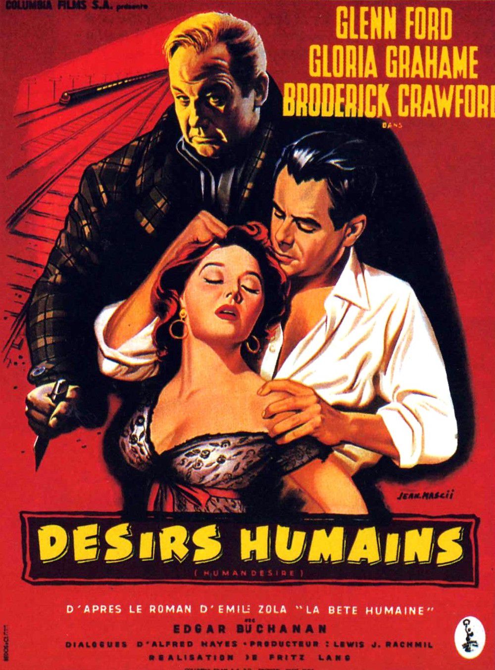 Un Fritz Lang de moyenne qualité. Tout d'abord, je dois dire que je suis loin d'être un très grand fan de "La Bête humaine" de Jean Renoir, dont "Désirs humains" s'inspire visiblement, mais la version de Renoir est de loin au-dessus de celle-ci, en partie parce que Gleen Ford n'arrive à dégager autant d'intensité que Jean Gabin. L'interprétation du couple Broderick Crawford-Gloria Grahame est assez convaincante bien que parfois celle-ci manque aussi parfois d'intensité en particulier dans les scènes de ménage. Fritz Lang a quand même réussi à arriver à un résultat correct en filmant remarquablement bien certaines séquences surtout celles se passant sur les rails. Bon sans plus. Une femme manipulatrice, des hommes faibles, sans honneur, la vie simple d'un trio amoureux qui ne bouscule pas le genre, qui se laisse regarder sans un intérêt majeur, car il manque un peu de tension, de nervosité, on passe à travers, comme lorsque l'on regarde le paysage d'un train à grande vitesse...on se laisse prendre au jeu et on oublie aussi vite. Ce n'est pas le meilleur des films noirs, pourtant sa distribution, était prometteuse avec des spécialistes du genre, et un grand réalisateur que l'on a connu plus inspiré. Le scénario est bien trop faiblement remanié pour sortir des rails du roman et du film la bête humaine sans casse. Néanmoins si on fait abstraction de ça on dira que le film reste correct. Pas le meilleur film de Lang en Amérique, mais un bon remake toutefois de la Bête humaine, de Renoir. Au petit jeu du triangle amoureux Glenn Ford, Gloria Grahame, et Broderick, ce dernier emporte largement la palme et prouve qu'il pouvait être bien mieux qu'un faire-valoir pour les deux premiers. Certes, Gloria Grahame joue une garce exquise, mais l'intrigue, à force d'être édulcorée, perd de sa force psychologique. Dommage. Les puristes préfèreront se jeter sur le chef-d’œuvre... de Zola !
