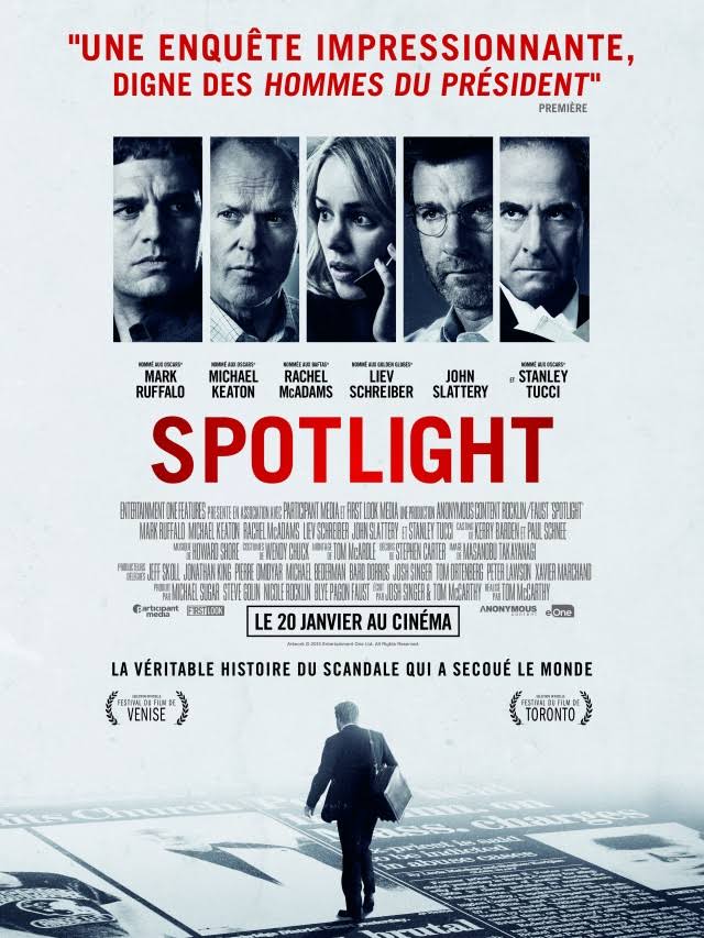 "Spotlight" s'inscrit dans la grande tradition américaine des films d'enquête journalistique comme "Les Hommes du président" (1976), chef-d'œuvre d'Alan J. Pakula sur l'affaire du Watergate. Et ce film de Tom McCarthy, cinq fois nommé aux Oscars, se révèle tout aussi passionnant. Une oeuvre sans artifice ni concession à la dramaturgie hollywoodienne qui aurait nuit à la sincérité de l’entreprise. Un futur classique, à n’en pas douter. Tom McCarthy choisit de tout mettre en retrait, mise en scène, musique, interprétations, dans le but d’éviter toute théâtralisation qui desservirait son sujet et laisse sa reconstitution méticuleuse nous passionner de bout en bout. Le réalisateur américain restitue avec respect et minutie les différents rebondissements d’une histoire stupéfiante et complexe, qui tient en haleine jusqu’au bout grâce à une interprétation au cordeau. En contant, de façon très documentée, l'investigation journalistique qui fit éclater le scandale des prêtres pédophiles aux États-Unis, Tom McCarthy livre un geste citoyen et rend un hommage digne et inspiré au métier. Basé sur une histoire vraie, le film se suit comme un polar haletant grâce à ses rebondissements et ses personnages servis par des acteurs de haut vol. Film haletant, même si l’aspect monomaniaque du récit le rend parfois étouffant. Avec son scénario pour seule feuille de route, "Spotlight" est un cas limite de film-dossier, régi du premier au dernier plan par les principes gouvernant les classiques du genre.