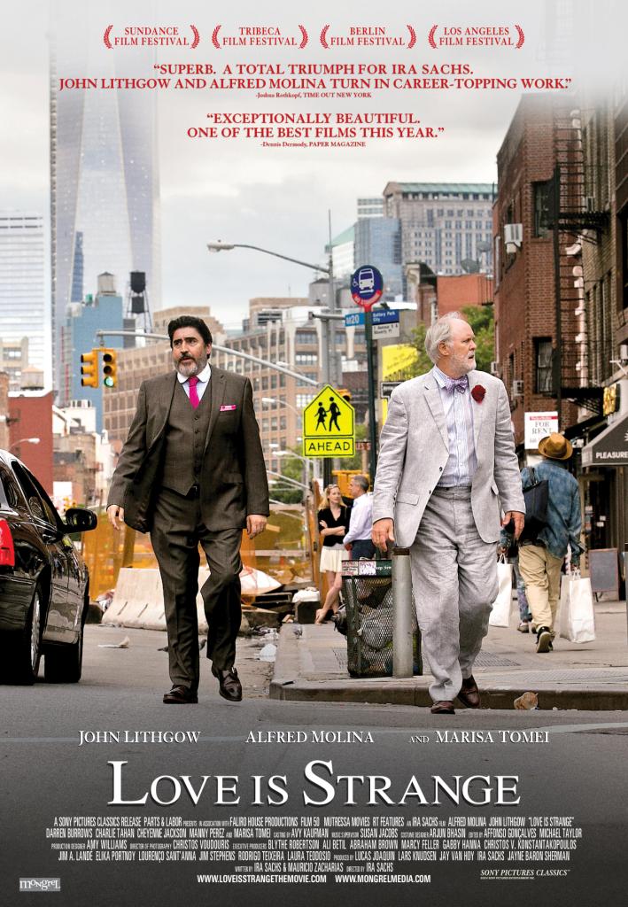 Une tonalité calme, faite de musique et de chuchotements, une persévérance qui devient peu à peu la forme même du film, qui sécrète une extraordinaire puissance d’émotion. "Love is Strange", et le film l’est tout autant : l’émotion advient sans fracas et pourtant étreint soudainement, sans que l’on puisse s’y préparer. Un film discrètement mélancolique qui sait, de façon pudique et légère, parler moins d’homosexualité que d’amour, et confronter celui-ci à l’âge qui vient. Cette chronique douce-amère d'un couple gay très classique dans sa forme en dit long sur les discriminations dont les homosexuels sont parfois l'objet aux Etats-Unis. Le plaisir pris au film, à sa mise en scène élégante, humaniste et classieuse, est tel qu’on lui pardonnerait tout. Une réflexion fine, et finalement tendre, sur la famille dans ses acceptions les plus contemporaines, et sur l'amour au sens le plus large. Le film d'Ira Sachs explore par petites touches de nouveau chapitre de vie et nous dépeint avec délicatesse une intimité fragmentée. C’est sensible et fin, mais pas très concret. Une triste et belle ellipse conclusive ne suffira pas à sauver le film de cette confusion fatale entre simplicité et banalité, qui reviendra peser sur l'ultime plan de tout son poids de niaiserie irisée.