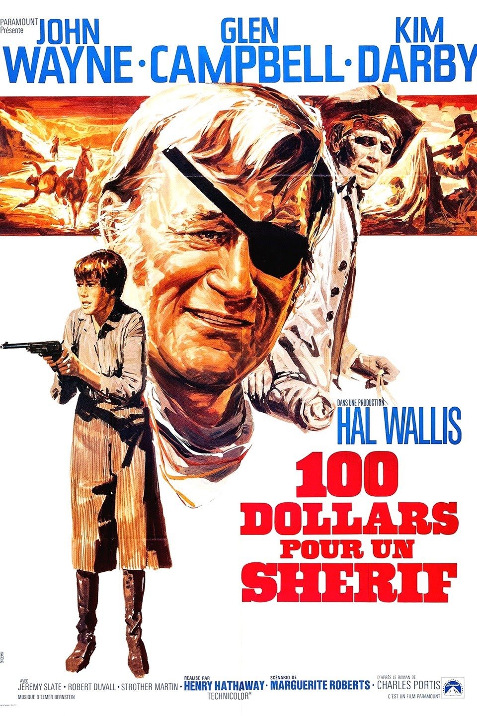 Ce film est l'avant dernier célèbre western du réalisateur et reste pour moi un de ses meilleurs. Le premier film de John Wayne où l'homme ne joue pas le géant représentant l'Amérique conquérante mais un vieil homme borgne. La mise en scène n'est pas grandiose mais le film mise en grande partie sur la prouesse des acteurs. John Wayne connaîtra la consécration avec l'unique oscar de sa carrière. Si l’histoire est un peu faible,le caractère des personnages emporte tout le film. John Wayne est formidablement drôle en vieux shérif bougon alcoolique,son interprétation et de loin la plus drôle de sa carrière. Le duo qu'il forme avec la jeune Kim Darby fonctionne à merveille,le tout donne de très bons moments d'aventure. Eh bien, ce n'est peut-être pas un chef d'oeuvre du genre mais "Cent dollars pour un shérif" a toutes les qualités pour faire un très bon western. Le film prend son temps mais étant donné que l'écran est bien rempli et que les personnages sont bien composés cela n'est nullement gênant. Surtout qu'Henry Hathaway, plus de 70 ans au compteur mais au sommet de ses capacités, prouve qu'il est toujours un crack pour ce qui est de filmer en extérieurs. Et sans aller jusqu'à lui décerner l'Oscar, il faut reconnaître que John Wayne en vieux marshall borgne, bedonnant et très porté sur la bouteille a rarement été en aussi grande forme. Face à lui, Kim Darby s'en sort à merveille dans le rôle de la jeune femme de caractère et forme un duo qui fonctionne très bien avec le Duke. Jeff Corey et Robert Duvall composent quand à eux des méchants très intéressants. Peut-être un petit classique du genre.