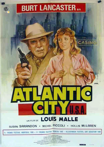 A l'instar d'un Jean Renoir, Louis Malle a également connu sa période américaine et "Atlantic City" en est sûrement l'oeuvre la plus réputée. L'intrigue ne casse pas des briques mais on la suit sans déplaisir. La curiosité principale de ce long métrage vient avant tout de la présence de Burt Lancaster en vieux caïd nostalgique. Rien d'extraordinaire mais un film tout ce qu'il y a de plus sympathique. «Atlantic City» ou la chronique désabusée d'une ville fuyant son passé, à l'image des deux êtres qui s'y rencontrent. Louis Malle, avec la subtile sensibilité qui est la sienne, dépeint sans fard une Amérique qui se cherche, à la croisée des diverses générations qui s'y cotoient. Ex-cité luxueuse et de prestige, Atlantic City est devenue un taudis, une ville défigurée, nostalgique de son passé glorieux mais déterminée en même temps à renaître de ses cendres. Il en est de même pour Lou l'anti-héros, petit gangster au coeur tendre et trop mou, joué par un Burt Lancaster au crépuscule de sa vie (et de sa carrière). Véritable coup de maître, c'est un film terriblement émouvant sur des gens simples, qui se rêvent princesses ou bandits de grands chemins, qui au fond n'ont qu'une idée : partir au loin et tout oublier, mais qui restent finalement là où ils ont vécu, ne pouvant se résoudre à quitter une si grosse partie d'eux-mêmes, la terre qui les a accueillis. A "Atlantic City", une serveuse de casino est mêlée à une histoire de drogue via son mari junkie, et un vieux voisin anciennement criminel. L'intérêt du film est, entre autres, son atmosphère délabrée et nostalgique, qui évoque une ville qui a eu un passé notable et qui n'est plus que l'ombre d'elle-même. A l'image du personnage remarquablement interprété par Burt Lancaster, qui campe un ancien truand ringard, obsédé par son manque de notoriété dans le milieu et son impuissance devant les situations dont il est témoin. Face à lui, Susan Sarandon est forte charismatique en serveuse aux rêves minés par son entourage, et l'on remarque une apparition de Michel Piccoli en cadre de casino ambigu. Si ce drame n'a rien d'exceptionnel, il demeure tout à fait appréciable, notamment grâce à certaines situations bien trouvées. L'atmosphère un peu étrange du film qu'insuffle Louis Malle est assez envoûtante au début qui se perd un peu par la suite mais "Atlantic City" se regarde du début jusqu'à la fin sans déplaisir. L'aspect "fin d'une époque" manque un peu de subtilité, parfois trop appuyé ou au contraire trop négligé pendant de longs moments, et on peut légitimement se demander l'utilité du personnage interprété par Michel Piccoli. Si Susan Sarandon est très convaincante, c'est surtout Burt Lancaster qui brille dans la figure émouvante d'un ancien gangster loser et il arrive à lui seul à donner la plus grande partie de l'intérêt que dégage le film. Si ce n'est pratiquement tout l'intérêt. Il y joue sans conteste son meilleur rôle avec celui du prince Salina dans "Le Guépard", autre film sur la fin d'une époque. Indispensable pour ceux qui veulent voir une grande star hollywoodienne au sommet de son art. C'est un ballet de personnages désenchantés : un couple hippie en phase de décomposition terminale, un vieux-beau qui s'est inventé un passé de cador dans le crime organisé, une quarantenaire qui ose encore rêver à des lendemains qui chantent mais dont la vie est morose... Tous vont se croiser sur les planches usées d'Atlantic City, esquissant un dernier pas de danse avant de disparaître (dramatiquement ou avec élégance, selon). Il n'y a plus rien à attendre du rêve américain, si ce n'est se réfugier dans le fantasme de son passé, ou fuir, le plus loin possible. Polar en creux, le film suit une narration un peu erratique très à la mode alors, Malle essayant de reproduire le geste d'un Lumet ou d'un Schatzberg sans en avoir vraiment l'étoffe. Il en demeure le plaisir de retrouver un Burt Lancaster magistral dans une version Prisunic du "Guépard" et la toujours resplendissante Susan Sarandon.