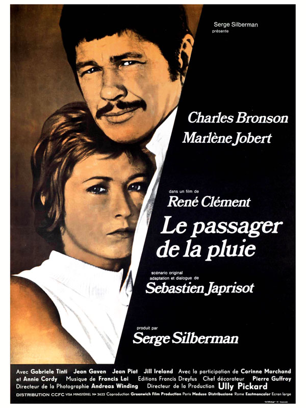 Une sorte de thriller plan-plan qui ne provoque ni frissons ni intérêts.De plus,sur une trame éculée(un inspecteur de police harcèle une femme pour qu'elle avoue un meurtre)préfère les dialogues insipides et les longueurs insignifiantes.Le jeu du chat et de la souris de Charles Bronson et Marlène Jobert n'est pas crédible une seconde à l'image de leur interprétation.Lui,récite son texte en Français phonétiquement,se contente de gonfler les biscottos et de lançer son regard langourant.Elle,passe son temps à minauder et à geindre.Comment croire qu'elle ait pu tuer son agresseur de sang-froid?"Le Passager de la pluie"(1969) est finalement sans mystère,ni rebondissements. Si ce n’est l’orgueil de faire venir jouer Charles Bronson sur la côte d’azur, il est difficile de comprendre ce que René Clément à chercher à obtenir en mettant en scène cette triste histoire de chantage. Nous imposer ainsi deux heures d’un face à face sans enjeu intéressant filmé à un rythme soporifique, ne nous menant que vers une conclusion maladroitement alambiquée passant par de futiles passages mélodramatiques, était déjà un pari risqué, mais quand, en plus, les acteurs ne semblent pas motivés, le projet est voué à l'échec… Ça ne marche pas car les acteurs sont mauvais. Extraordinaire femme-enfant Marlène Jobert pouvait être très émouvante lorsqu'elle était tenue et qu'on ne la laissait pas faire ses petits "poui !" à la Marilyn de seconde zone (rétrécie de surcroît). Dans Nous ne Vieillirons pas ensemble (72) ou Pialat la surveille comme de l'huile sur le feu, Marlène Jobert nous a fait tous pleurer. Bronson, avec son masque indien et les muscles qu'on voit sous ses vêtements, n'a même pas besoin de bouger pour être l'incarnation de l'homme-le-vrai (pourquoi pas ?). Quand il est impassible il est devenu un mythe avec Sergio Leone. Mais là, il parle beaucoup, il s'explique, il tente de convaincre, il sourit (l'horreur totale : Bronson sourit !), il fait les yeux doux : bref il essaye de faire exactement de l'anti-bronson et ça, le vrai Bronson ne sait pas faire. Résultat, le face-à-face pyschologique est totalement raté.
