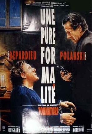Une pure formalité (Una pura formalità) est un film italo-français réalisé par Giuseppe Tornatore en 1994. Un grand film dont l'excellent scénario est écrit par Giuseppe Tornatore et Pascal Quignard. Un film étrange, déroutant, un huis-clos dans un lieu mystérieux, de très bon seconds rôles et un formidable duo porté par deux monstres du cinéma. formidable tête à tête entre deux grands acteurs : Gérard Depardieu et Roman Polanski. La musique est signé par le grand Ennio Morricone. Un film prenant, envoûtant a ne pas spoilier. Une fois entré dedans, on n'en ressort pas. "Une pure formalité" est avant tout une curiosité, tout d'abord dans l'histoire déroutante, et ensuite dans le face à face improbable Depardieu/Polanski. Rien que pour ces deux monstres du cinéma, ça vaut le détour. "Une pure formalité" propose une histoire palpitante, bien que peu mouvementée, pour un huis-clos déroutant. On nous plonge dans un mystère, dans lequel le personnage incarné à merveille pas Depardieu se retrouve empêtré, dont Polanski est chargé de résoudre. On n'en sait pas plus que lui, et on prend énormément de plaisir à voir les choses s'éclaircir peu à peu, ou alors à voir le mystère s'épaissir, jusqu'à un dénouement assez inattendu. Le titre à double sens s'avère judicieux, et contribue à marquer le spectateur, lorsqu'il en comprend le vrai sens. A défaut d'être fondamental, "Une pure formalité" marque néanmoins les esprits, et ce dans le bon sens du terme. Comment écrire sur ce film sans être prétentieux ou à côté de la plaque ? Je n'en dirais donc que peu de chose. Un film sur l'après... Y a-t-il quelque chose après ? Après une mort violente et préméditée, passe-t-on par un " interrogatoire " poussé au cours duquel on prend conscience qu'on est plus. Plus rien dans le sens où on n'existe plus pour le monde des vivants. Pour ceux qui restent, il reste des images et une histoire, des souvenirs, des remords et des regrets mais il n'y a plus personne au bout du fil... Les acteurs sont prodigieux. La réalisation extraordinaire. Formidable scénario avec une énigme originale qu'on ne découvre qu'à la fin du film et une atmosphère à la Tarkovski - Un formidable rôle pour Gérard Depardieu - Polanski "patenotrement" effrayant -Ca c'est du cinéma ! On peut détester Depardieu l’homme mais le comédien est bel et bien le plus grand acteur français actuel. Il nous prouve une fois de plus l’étendue de son talent dans ce film et passe de la colère, même cruauté à la tristesse et au questionnement puis à la résignation. Onoff, le grand écrivain qu’il joue se retrouve dans un huis clos au commissariat et bloqué la nuit par une pluie abondante, une coupure d’électricité et de téléphone. Face à lui Polanski, le commissaire qui a lu et relu ses livres jusqu’à connaitre par cœur des passages l’interroge par pure formalité mais se transformera au fil de la nuit en véritable interrogatoire. Un cadavre a été trouvé près de la maison d’Onoff. Qu’a-t-il fait la veille ? Qui est la victime ? Est-il impliqué ? Depardieu est magistral face aux photos retrouvées par le commissaire puis face aux pages blanches de sa déposition. A voir pour ce superbe face à face. J'ai regardé ce film au moins une dizaine de fois depuis sa sortie en France, c'est-à-dire depuis plus de 25 ans, et je ne m'en lasse pas. On peut le voir à n'importe quel degré, lui donner le sens qu'on veut : thriller, polar, film noir, film métaphysique, méditation sur ce qui constitue l'identité de l'homme (le souvenir ?). La cure subie par Oloff est brutale, c'est à un accouchement de soi-même auquel on assiste, difficile, violent, mais le héros en sort transfiguré grâce à son passeur psycho-pompe, le commissaire de police. C'est un film superbe : la première partie est austère, on s'enfonce dans le marécage de la déréliction. Puis l'image, s'éclaire peu à peu... la lumière commence à pénétrer dans ce poste de police déshérité, au fond de nulle part, et on sent que quelque chose d'autre est possible, peut-être, quelque chose de moins désespérant... on n'ose y croire, et pourtant.... Superbe.... la fin me donne toujours la chair de poule. La belle chanson écrite par Pascal Quignard (tout le scénarion est d'ailleurs de Quignard), "Ricordare," véritable leitmotiv de la seconde partie du film l'éclaire et suggère une possible issue..