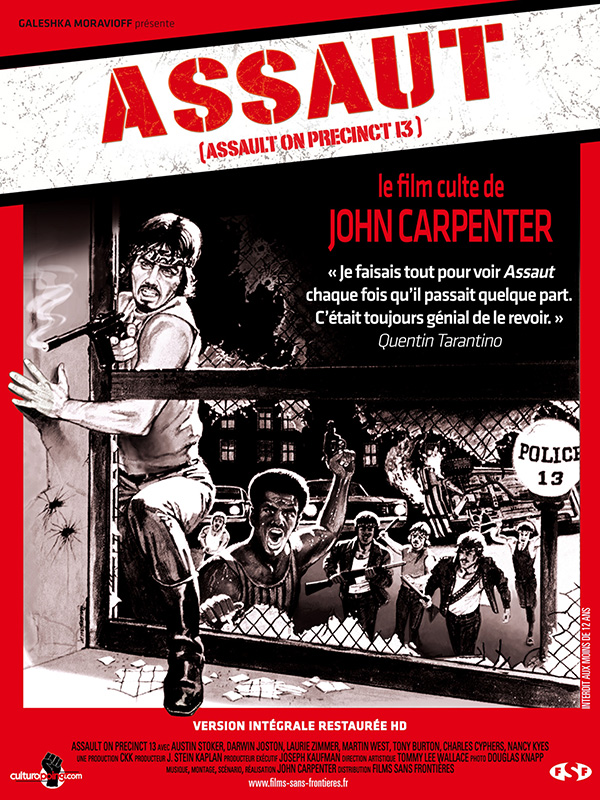 Le premier film de John Carpenter est devenu culte car il était précurseur en son temps : un suspense en huis clos mené sur une musique lancinante avec un tension qui monte crescendo. Basé sur la peur de l'incompréhensible et l'ennemi invisible, un pur thriller urbain mainte fois copié mais rarement égalé. Si ce n'est pas son meilleur film (et la concurrence est pas mal !), c'est un bon film où nous sert une belle mise en scène capable de créer de la tension et à donner une atmosphère angoissante et étouffante tout le long du film. Son récit est bien rythmé, on n'a pas vraiment le temps de s'ennuyer, Carpenter prend d'abord le temps de mettre en place l'histoire et les personnages avant de passer vraiment à l'assaut. Comme souvent chez Carpenter on a une musique qui contribue bien à l'atmosphère, c'est le cas ici et il faut bien reconnaitre que c'est bien prenant dès qu'elle apparaît. Film culte de John Carpenter et du cinéma d'action, Assaut est l'ancêtre des films d'actions modernes. Le film suit l'histoire de plusieurs personnages qui n'ont rien à voir et qui vont finir par se retrouver au même endroit. Assaut est donc un huis clos. On est dans un commissariat de police pris d'assaut par des gangsters. Au niveau de la mise en scène, c'est irréprochable. L'ambiance est incroyable, servie par une bande son excellente. L'action est crédible et bien pensée. Le film compense parfaitement son faible budget par une maîtrise parfaite de l'action (qui ne fait pas dans la surenchère). Le scénario est simple mais diablement efficace, Réalisée sans grands moyens,mais avec une inventivité totale,"Assaut"(1976)de John Carpenter,marqua une étape importante dans l'évolution du film d'action.Le pitch est diablement malin.Des assiégés dans un commissariat de police contre des assiégeants très inquiétants.C'est une sorte d'une relecture de "Rio Bravo",mais l'hommage s'étend aussi à "La nuit des morts-vivants",avec des assaillants qui se déplacent presque comme des zombies,et qui ne parlent jamais. Un des premiers film de Carpenter et l'un de ses meilleurs sans doute, Assaut qui reprend le thème du fort encerclé par les Indiens mais avec un commissariat pratiquement vide dont les occupants devront affronter face une bande de voyous violents et sans pitié. Ne l'ayant pas revu depuis longtemps je constate avec plaisir qu'Assaut garde de nos jours son impact Un film pas si connu que ça mais qui semble avoir inspiré pas mal de monde dont un remake raté (Assaut sur le central 13). Hommage à Hawks (que Carpenter adore), exercice de style claustrophobique, "Assault on Precinct 13" est le meilleur Carpenter après "The Thing". Bien que le film se déroule dans un environnement ultra-réaliste, il s'en dégage pourtant une impression surnaturelle, le coup de maître consistant à rendre les assaillants inidentifiables, ombres violentes, peurs en mouvement. Tout comme dans "Fog", "Halloween" ou "The Thing", les hommes ne sont finalement en prise qu'avec un "monstre-mirroir" qui ne fait que reflèter la monstruosité humaine. Petits moyens, grosse réussite.