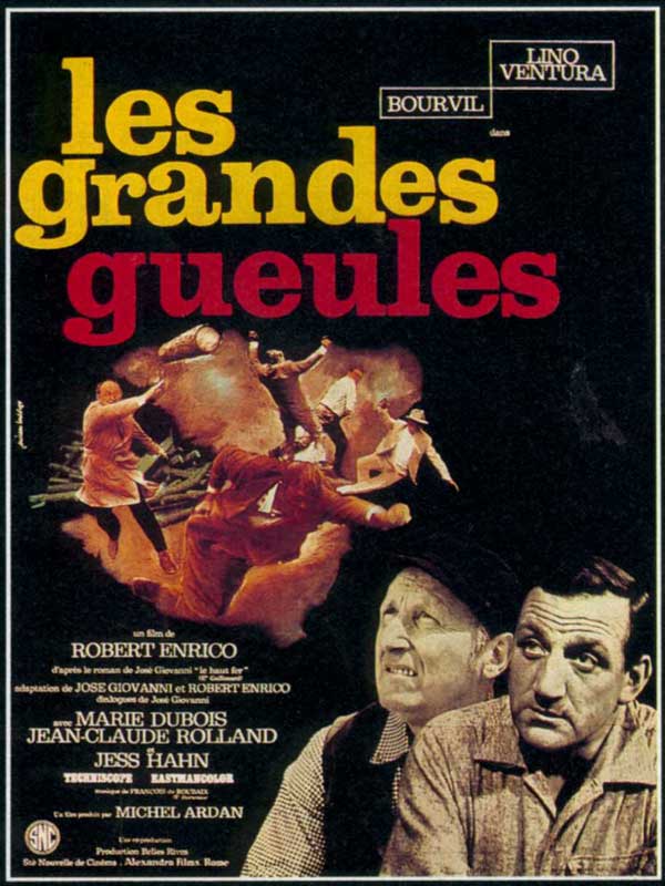 Les grands gueules est typiquement le genre de film qui vient d'une époque révolue, celle de durs au cœurs tendre. C'est l'histoire d'une rencontre entre un petit patron de scierie et un d'homme cherchant à casé des ex détenus. Dans un premier temps les deux hommes vont chacun y trouver leur compte,puis ils vont se prendre d'amitié. Enrico fait un film de bonne facture, qui allie la bonne humeur et le drame. De bons acteurs au sommet de leur art, pour un film qui a malgré tout bien vieillit. La manière de filmer , le "surjeu" , tout cela fait démodé, et démontre bien la faiblesse de Enrico, qui ne reste pas comme un grand styliste du 7e art..On s'ennuie souvent et le scénario reste bien faible. Je reste un peu sur ma faim mais le film est prenant. Les difficultés de la reprise d'une scierie pour Bourvil, en patron. Face à un concurrent peu scrupuleux, il va embaucher des prisonniers aux grandes gueules. Des amitiés et des conflits vont naître. Bien que le film dure plus de 2 heures, j'aurai aimé 30' à 1 heure de plus pour savoir ce que deviennent les personnages. Un film très humain, cependant. Le film vaut surtout pour la rencontre entre Bourvil et Lino Ventura et par son sujet plutôt courageux, la réinsertion des ex-détenus. Dommage qu'il n'y ait pas un peu de liant dans le scénario pas vraiment de fil conducteur. Des coups de gueule, des bagarres et parfois des répliques enlevées. Bon film populaire que ces "Grandes gueules" avec en tête de distribution Bourvil, Lino Ventura, Michel Constantin, Jess Hahn, d'après le roman "Le Haut-Fer" de Josè Giovanni qui a transformè ici la nouvelle en scènario! Robert Enrico a tournè son film sur les lieux mêmes où Giovanni a situé son roman: dans la clairière de Cellet, près de Gèrardmer (station de ski cèlèbre pour son festival de films fantastiques), situèe dans le beau dèpartement des Vosges (88). Western à la française, les Grandes Gueules met en scène les deux monstres sacrés du cinéma français que sont Bourvil et Lino Ventura. Ces deux-là prennent un plaisir évident à se trouver ensemble et cela nous fait oublier les quelques faiblesses du scénario.
