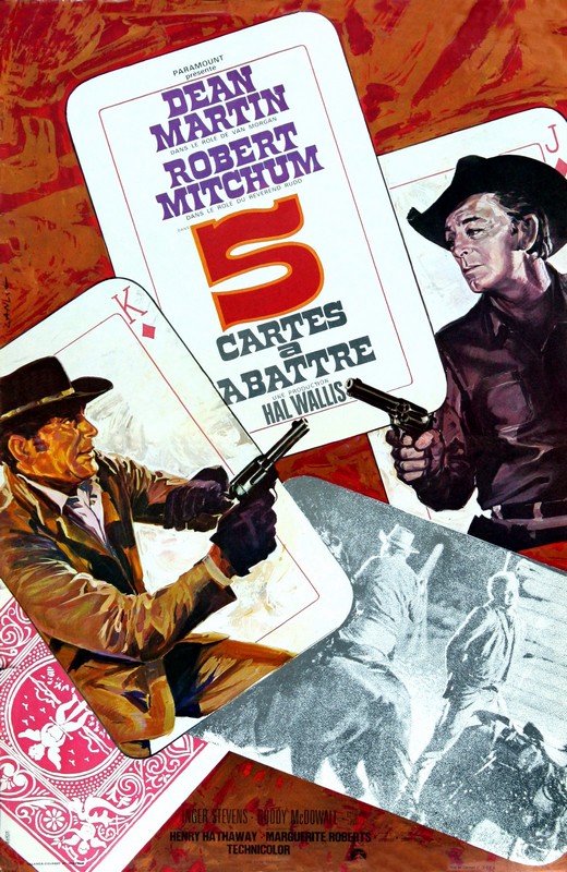 Je savais bien que 5 cartes a abattre ne serait pas un grand film mais je ne pensais pas que je le trouverais si moyen ; si certaines séquences (comme les meurtres) sont réussies l'ensemble est plutôt pâle. C'est du à une mise en scène qui manque de punch, ça manque de nervosité et de suspense ; tout est trop calme. Par contre on a droit à une belle chanson de Dean Martin... Voici les cartouches du film, Dean Martin le barillet vide, Robert Mitchum plutôt correcte et Roddy McDowall toujours excellent pour un western qui malheureusement ne tire pas loin. Manque de punch, deux petites scènes agréables pour entre temps pas mal de faiblesse ou les spectateurs feront du surplace de parlote autour d'un cimetière... La plus mauvaise note se trouve dans la composition de Maurice Jarre. Déception donc pour ce long-métrage d'Henry Hathaway.