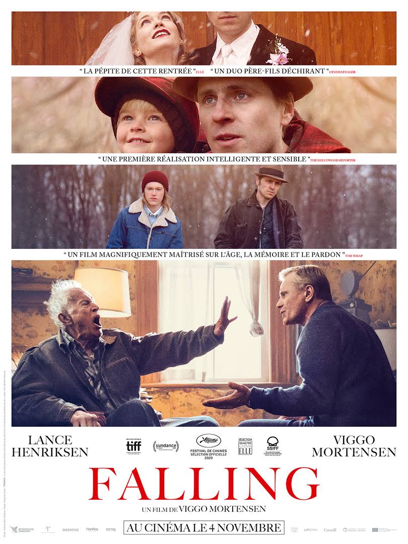 Une vraie réussite pour la réouverture des salles que ce "Falling", joué et réalisé par l'immense Viggo Mortensen. Celui-ci campe le personnage de John, homosexuel en couple, qui va accueillir Willis son père âgé qui n'a pas la même vision de la vie, loin de là. le réalisateur débutant sait mettre en avant le poids que peut représenter ce père au langage fleuri et aux idées bien arrêtées. L'analyse de la relation filiale est très juste avec des flashbacks bien sentis. C'est souvent pudique mais surtout très drôle quand il s'agit des écarts de conduite ou des propos sans filtre du grand-père. Un très beau portrait père /fils. J'ai beaucoup aimé l'atmosphère du film et les dialogues faits de vérités incontournables même si elles tournent toujours autour du refoulement des uns et des autres , de l'homosexualité et de la vulgarité...Le père veut tuer le fils (anti Œdipe) ...Le film est d'une grande tendresse accentuée par la musique au piano ( Schuman et des images d'une grande douceur....Le scénario est fait de flash back intenses, et de moments plus poétiques.....Tout tourne autour du caractère du père (grand père) et les enfants, petits enfants souffrent tous de son attitude de cowboy viril....La virilité semble l'enjeu du film, mais c'est fait avec art et application...On ne s'ennuie pas, l'atmosphère est douce, L'Amérique cherche sa voie, c'est de cela dont nous parle Vigo Mortensen. La première de Viggo Mortensen du côté de la réalisation et c'est un très beau film proposé ! Une très jolie fresque familiale, illustrant une difficile fin de vie avec démence . C'est pourtant dans un tel contexte, que VM affute la précision de son rôle ( c'est le fils). Les dialogues sont subtils, bien que souvent "très acides" et le père (Lance Henriksen) ne manque pas de reprocher, à la fois le choix de vie de son fils, de son ex-femme, ne sait plus qui est vivant ou pas, relève de la plus grande violence verbale, raciste et homophobe notoire...C'est donc un portrait à deux faces, la douceur, la modestie et la bienveillance face à la démesure dans l'indécence et la méchanceté dans ces rapports "père-fils" - Belles images et fabuleuse lumière.
