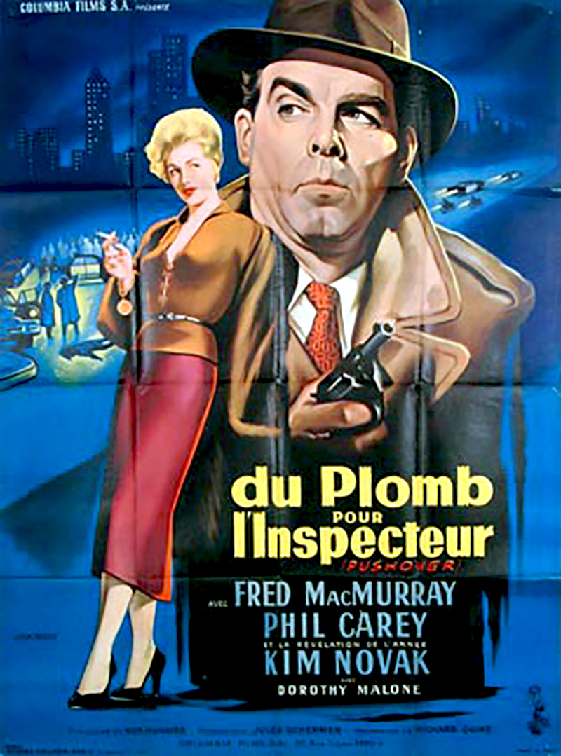 Un film noir signé par un spécialiste du genre, Richard Quine. Cette fois-ci, le cinéaste sort l'artillerie lourde en donnant le rôle phare de son film à l'imposant Fred MacMurray, l'inoubliable agent d'assurance d'"Assurance sur la mort". Cette fois-ci, l'acteur enfile le costume d'un flic désorienté et désaxé qui tombe dans les griffes d'une femme fatale interprétée avec maestria par une Kim Novak étincelante de beauté. Le résultat est à la hauteur des espérances de son auteur grâce à cette dualité remarquablement transmise par un Fred MacMurray au sommet de son art. Un très bon film noir. Un très bon polar bien rythmé et passionnant (même si l'issue ne fait aucun doute). Le film fonctionne "à l'envers" puisque c'est à Fred MacMurray en pleine forme et à Kim Novak, éclatante de beauté que l'on s'identifie, alors que bizarrement Dorothy Malone qui peut être fabuleuse est ici bien fade. C'est bien réalisé et superbement photographié, on ne s'ennuie pas une seconde. A découvrir ! Il y a des films, comme ca, que les distributeurs français ont affublé d'un titre idiot, alors que ce sont de véritables perles. C'est également le cas par exemple du Flic était presque parfait (The Hit) de Stephen Frears. Pushover fait partie des meilleurs films noirs américains, même s'il a été réalisé à un moment où le genre commencait à décliner. Il a évidemment des point communs avec Assurance sur la mort, le chef d'oeuvre du genre, tourné 10 ans auparavant avec le même acteur, l'étonnant Fred Mac Murray. Dans les deux films, il s'agit d'un homme respectable qui, a un moment, déraille et passe de l'autre côté de la loi. Par deux fois, il est "victime" d'une femme fatale, qui l'entraine dans des combines qui l'amèneront à sa perte. Dans Pushover, ce personnage a vieilli, il a un poste pas particulièrement reluisant (inspecteur de police), et il est évident que c'est un homme qui avait de plus hautes aspirations. A un moment donné, il a l'occasion d'être riche et aimé d'une très jolie femme, et ce moment là mettra en exergue l'aliénation qui le caractérise et dont souffrent la plupart des héros du film noir. Le film est remarquable dans la désricption de ce passage du banal vers le mal. A la différence du simple gangster, ce héros garde la sympathie du spectateur car celui ci s' identifie aux démons qui le rongent. Ajoutons à cela que le suspens est très bien mené, que l'interprétation est de haut vol, et revenons au précepte de cette critique : ce film noir est une véritable Un excellent polar signé Richard Quine en 1956 !! Au départ, le film me faisait penser à "Etroite surveillance" de John Badham sorti en salles dans les années 80 avec la surveillance de deux policiers sur l'appartement de la fiancée d'un gangster dangereux qui vient de commettre un braquage avec un mort, les jumelles, les comptes rendus sur le papier , l'histoire d'amour entre un inspecteur et la suspecte a une ressemblance dans le trame mais "Du plomb pour l'inspecteur" est plus sérieux, plus machiavélique, plus dramatique. Le policier a du fil a retordre pour aimer cette femme pour camoufler des actes involontaires et cacher la relation du coté de ses supérieurs et ses collègues. Le personnage principal est incarné par le remarquable Fred Mc Murray, la femme du gangster est joué par Kim Novak dont c'est le premier rôle au cinéma et il y a la jolie Dorothy Malone qui joue la voisine. Tout les ingrédients du film noir sont réunis, les décors et les lumières qui reflètent l'atmosphère de mème que la musique captivante. C'est le premier long métrage du cinéaste Richard Quine que je découvre et il me tarde de creuser sa filmographie.