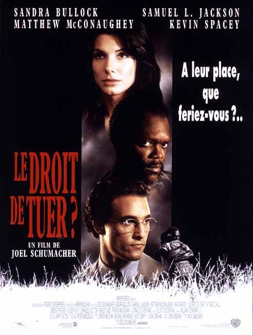 Adaptation d'un livre de John Grisham, "A Time to kill" en reprend la trame scénaristique pas forcément complexe mais solide et expose de façon assez manichéenne le problème encore très présent du racisme poussé à l'extrême dans les états sudistes. On notera un casting efficace qui parait aujourd'hui impressionnant de nom, la réalisation étant elle conventionnelle. Néanmoins, ce film demeure honorable dans l'oeuvre très inégale de Joel Schumacher. Capable du meilleur comme du pire, Joel Schumacher nous propose ici un sympathique film judiciaire. L'intrigue se suit avec plaisir au rythme du procés et des différents rebondissement mais le tout sonne néanmoins de manière très téléphoné, parfois même lisse jusqu'à sa conclusion exagérément larmoyante. Cette tendance du réalisateur à trop en faire s'estompe face à un casting d'enfer où chaque acteur rivalise de talent. Classique mais sympathique. Un titre en forme d’interrogation. A-t-on le droit de se faire justice soit-même pour un crime aussi répugnant que le viol d’une jeune gosse. Samuel L. Jackson ne s’est pas trop posé cette question dans cette adaptation du roman de John Grisham, il a appuyé sur la gâchette en toute connaissance de cause. Le contexte géographique et raciale du film rend le sujet particulièrement intéressant même si son déroulement, un peu longuet toutefois, aborde un bon nombre d’aspect caricatural et un parti pris cousu de fil blanc. Servi par un excellent casting sous la caméra de Joel Schumacher, « le Droit de Tuer ? » à l’avantage de lancer le débat. Un bon thriller de Schumacher (Il a fait des bons films) , qui pose de vraies questions sur la justice américaine et la vengeance . Peut-on se faire justice soi-même ? C'est une question majeure dont le film donne un exemple , mais n'apporte ni argument ni réponse concrète . Le casting est très bon , et Matthew McConaughey a enfin un rôle intéressant (Son monologue final est vraiment sordide et malsain , l'acteur est vraiment crédible et ce sentiment met vraiment mal a l'aise) , la mise en scène de Joel Schumacher est ultra classique mais sans réelle limite morale (Certaines scènes sont vraiment horribles...) . Un film intéressant , inquiétant mais trop abstrait dans ses choix .