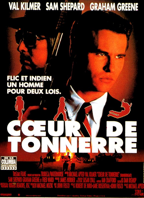 On peut y voir un western actuel dans lequel on oublie chevaux et cavalcades dans le désert pour se concentrer sur des courses de voitures et des sujets actuels comme l'écologie et l'exploitation des minorités effectivement. Malgré tout je n'ai pas été séduit par l'interprétation trop brute et par les aboutissants finalement assez attendus. Un polar dont l'intrigue se passe dans une réserve indienne. L'enquête est un peu molle mais plusieurs scènes sont pas mal tournées. Il y a aussi un propos social sur les conditions de vie des indiens encore de nos jours. Même si elle est inspirée de faits ayant réellement eu lieu dans les années 70, l'intrigue policière est surtout prétexte à mettre en lumière la richesse et les croyances de la culture des amérindiens et aussi bien sûr un passé peu reluisant pour les Etats-Unis. Le film n'évite pas le didactisme (ce qu'avait habilement réussi à éviter par exemple Peter Weir dans une plongée dans une autre culture, celle des amish, dans "Witness" !!!) avec notamment le poncif du type qui a renié sa culture d'origine et qui va l'accepter peu à peu mais le film se fait prenant au fur et à mesure que l'intrigue avance pour un final qu'on voyait venir mais qui est présenté d'une manière un peu différente que celle à laquelle on s'attendait. Un honnête film policier à l'intrigue très classique. La façon dont le thème des Indiens d'Amérique est repris fait penser à "Danse avec les loups" ou "Le dernier des Mohicans" sans en avoir l'ampleur dramatique. Pas mal mais loin de laisser un souvenir impérissable et l'ensemble a pris un vilain coup de vieux. Produit par De Niro, Cœur de Tonnerre insiste beaucoup sur tout le folklore indien : les rituels, les croyances, le troc. Et toute la pauvreté présente dans les réserves en plus de la violence, de l'alcoolisme, du racisme, etc. L'enquête policière passe un peu au second plan avec ce jeune inspecteur aux origines indiennes mais se refusant à les admettre. Moi, elle ne m'a pas tellement intéressé et je pense que ce n'est pas non plus ce que Michael Apted a voulu mettre en avant. Mais plutôt le quotidien et la mythologie des indiens. Des paysages somptueux écrasés par un soleil de plomb, une ambiance western ne font pas tout. A voir éventuellement pour un Val Kilmer pas encore bouffi en 1992 et son propos politique. Un polar plutôt classique dans la forme même si son environnement est lui original. C’est en effet une plongé dans les réserves indiennes et ce peuple qui a été massacré et que les États Unis essaie de dissimuler sous le tapis. Dommage que la mise en scène soit assez plate et ne finisse par rendre le film commun. A noter la présence du trop rare Sam Shepard que je trouve toujours excellent et qui ne failli une nouvelle fois pas à la règle. Ce film de Michael Apted aurait pu être mieux réussi. Belle distribution avec notamment à l’affiche Val Kilmer, Sam Shepard, Fred Ward… Le scénario de ce film policier était plutôt pas mal mais le réalisateur n’a pas su l’exploité au maximum. Néanmoins malgré le fait que le film ne soit pas génial je souligne qu’il est relativement divertissant car on est pris dans l’histoire.