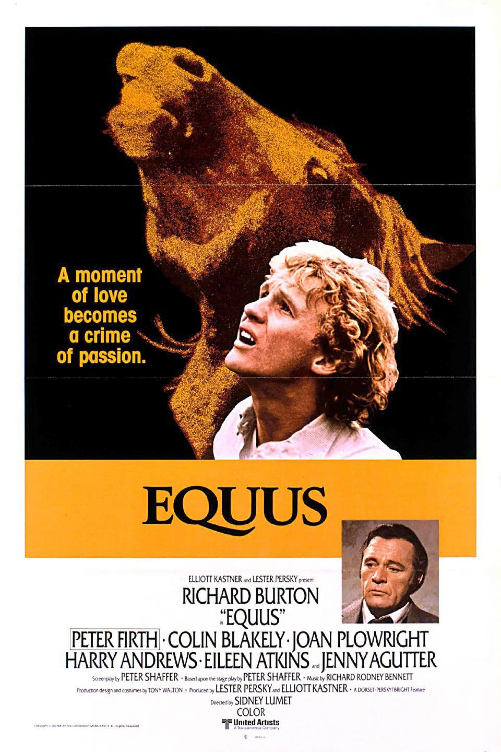 week-end depuis quelque temps et qui est en attente de jugement. "Equus" est un film bavard ce qui est parfois un problème quand on adapte une pièce de théâtre au cinéma. Mais Lumet est loin d'être un manchot et se sert des dialogues pour mieux plonger dans les troubles qui agitent le jeune Alan Strand qui vient à son tour troubler son psychiatre, le docteur Dysart. La mise en scène est classique mais efficace, le cinéaste laissant la force de son sujet (parfois un peu trop démonstratif) mener vers les émotions. Malgré tout, l'ensemble n'est pas toujours facile à suivre et parfois un peu trop bavard. Heureusement, on trouve dans les deux rôles principaux Richard Burton et Peter Firth. Burton, alors au crépuscule de sa carrière, donne une véritable profondeur psychologique à son personnage lessivé par la vie tandis que Firth, qui avait déjà tenu le rôle au théâtre nous livre une composition habitée.