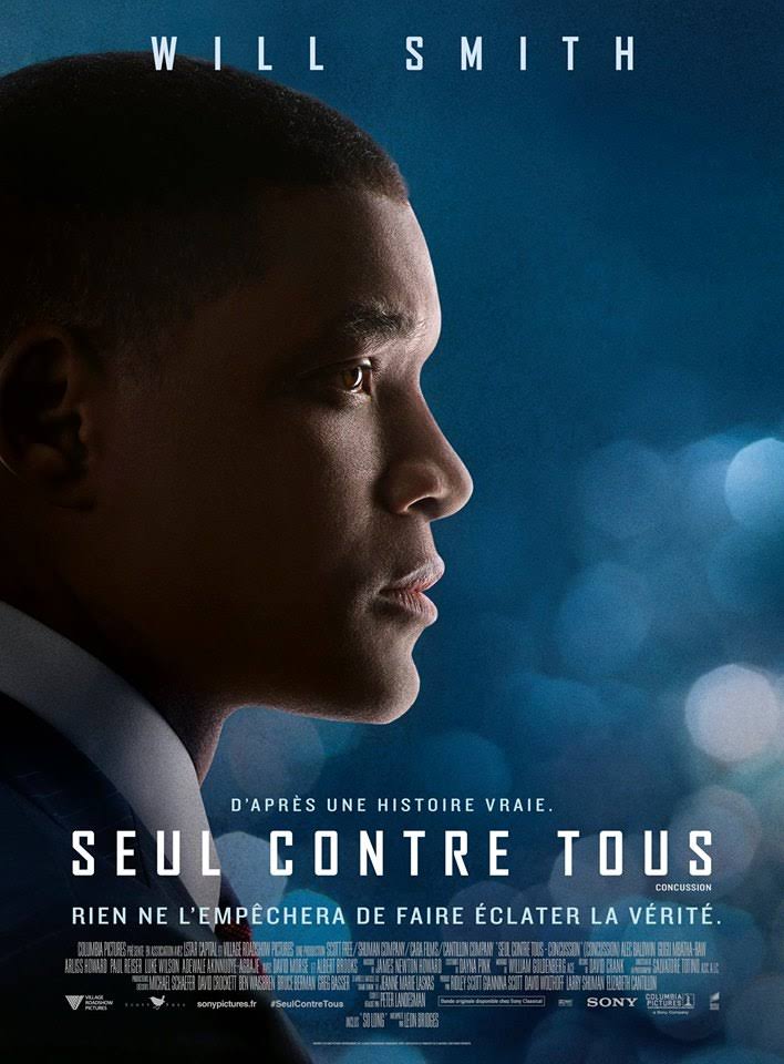 Qu’il semble loin le temps où la simple présence de Will Smith sur une affiche suffisait à donner envie à des millions de personnes de se ruer dans une salle de cinéma. C’est simple, aujourd’hui le public lui tourne le dos. « Seul contre tous » n’échappe pas à cette règle puisque outre-Atlantique, le film de Peter Landesman est un énorme bide. Mérité ? Peut-être… Le scandale provoqué par un médecin nigérian au sein du petit monde du football américain est typiquement ce genre d'histoire dont raffole Hollywood. Mais si le réalisateur du film n'arrive pas à faire preuve d'autant de courage que son personnage pour pointer du doigt la tout-puissante fédération sportive, on ne peut obtenir qu'un piètre résultat insignifiant. Et ce n'est pas la prestation crispée de Will Smith qui va sauver les choses. Une idée de base intéressante mais bon sang que c'est ennuyeux !!! C'est mou, répétitif et trop trop long ! On a l'impression de voir 3 films en 1 tant cela traine en longueur ! Will Smith n'est pas mauvais mais devient vite agaçant et malgré l'étiquette 'Histoire vraie' on n'arrive pas à s'emballer pour ce film ! Dommage il y aurait eu mieux à faire je pense ! Si le problème traité, celui de la "Commotion" (traduction de l'anglais "Concussion", type-même du "faux ami" pour un francophone !), terme générique pour viser les dommages gravissimes causés au cerveau de plus de 25 % des joueurs pros de ce sport de brutes qu'est le football américain, est important, ce film de Peter Landesman n'a strictement aucun intérêt, autre que (superficiellement) documentaire. C'est une grosse soupe édifiante et propagandiste (sur le "miracle" américain de l'intégration, et du "tout le monde peut réaliser son rêve" - et autres blablas) sans rythme, mou, ultra mou..... Will Smith, en pourfendeur de la NFL, se la joue (pense-t-il) "impliqué" et "pur comme le diamant" (ou quelque chose du genre). Il n'est que niais et amidonné (en alternance). Consternant de vide, tout ça.....