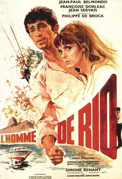 Revoir cette sublime chasse au trésor de Philippe De Broca rappelle tout ce que doit au cinéaste la saga Indiana Jones qui a elle-même servi de guide au genre d'aventure jusqu’à nos jours et l’arrivée des effets spéciaux. En 1964 De Broca est encore un tout jeune réalisateur qui après quelques comédies de mœurs avec Jean-Pierre Cassel vient de goûter au film populaire d’aventure avec « Cartouche » qui l’installe immédiatement dans le statut de metteur en scène à succès mais lui retire aussi tout crédit auprès de la critique intellectuelle de l’époque. Pourtant presque cinquante ans après les exploits de d’Antoine de Fourquet (Belmondo) et d’Agnès Villemosa (Françoise Dorléac), on ne peut qu’être admiratif devant tant d’ingéniosité, de modernité et de sens du rythme. L'homme de rio est l'incarnation des 60ies ! Une destination paradisiaque, des méchants en imper', borsalino et gants en cuir, une fille un peu cruche en robe courte qui fait la moue, et un Belmondo belmondiesque qui fait des cascades. Difficile aussi de ne pas faire le lien avec Tintin, tant les références (volontaire ou non) y sont nombreuses. Le scénario est un mélange de "l'oreille cassé" et du "temple du soleil", et on retrouve des scènes curieusement similaires (l'escalade sur le rebord de l’immeuble de "tintin en Amérique", le vol d'avion dans "les cigares du pharaon" et surtout les trois parchemins avec la fameuse phrase "de la lumière viendra la lumière" du "secret de la licorne"). Le film est un bon cocktail d'aventure et d'humour. On passe un bon moment malgré quelques passages un peu plus longuets en milieu de parcours . Le casting est parfait avec notamment Jean Paul Belmondo qui est parfait dans le rôle d' Adrien ce type qui va se démener comme un dingue pour tenter de ramener sa fiancée Agnès incarnée par la charmante Françoise Dorléac . On prend plaisir à suivre cette comédie d'aventure dans de beau décors et paysages brésiliens où le dépaysement est assuré . Une comédie d'aventure toujours agréable à voir même si elle à plus de 50 ans et contient un charme désuet pas désagréable . J'aime ce film parce que le peu de Paris qu'on y voit est beau, la musique est enlevée, Belmondo et Dorléac sont (très) attachants, l'humour, décalé et parfois grotesque, est omniprésent, l'aventure est sympathique, et les plans de Rio sont magnifiques. En clair, ce film me fait voyager, m'emporte très très loin, au Brésil. Ce pays est si bien montré dans ce film entre Rio, la jungle et Brasilia en cours de construction (plans magnifiques, et c'est peu dire, de cette ville), que j'ai envie de sauter dans l'avion et l'explorer comme un aventurier, comme Adrien le fait. Savoir si Broca a fait ce film de la façon pour laquelle je l'aime est impossible. On a rarement vu dans le cinéma français un film aussi dépaysant, amusant, bourré de charme et jubilatoire. Le couple Jean-Paul Belmondo / Françoise Dorléac est resplendissant de jeunesse, d'énergie et de fougue. Le scénario co-écrit par Jean-Paul Rappeneau, Ariane Mnouchkine, Daniel Boulanger et Philippe de Broca est tour à tour surprenant, hilarant, inquiétant...une véritable adaptation de Tintin au cinéma. Le cinéaste Philippe de Broca ne s'en est d'ailleurs jamais caché, le scénario est largement inspiré de celui de L'Oreille Cassée d'Hergé. Philippe de Broca trouvait en Belmondo son interprète idéal, qui ne se prenait pas au sérieux, casse-cou et véritable clown. Leur collaboration allait déboucher sur les plus grandes comédies populaires des années 60-70 en déclinant vers un non-sens, un pastiche, un surréalisme (dont l'apogée sera Le Magnifique) dont la comédie made-in-France de nos jours ferait bien de s'inspirer. L'Homme de Rio est devenu un Classique, un chef d'oeuvre du genre.