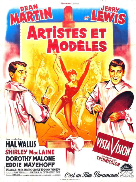 Considéré généralement comme le meilleur film du tandem Jerry Lewis-Dean Martin, je dois avouer que c'est pourtant un de ceux qui m'a le moins convaincu. Etant donné que c'est Frank Tashlin qui est derrière la caméra, on a bien sûr un univers très coloré et cartoonesque. Et s'il nous réserve comme toujours un scénario délirant et quelques gags excellents, les numéros musicaux, inutiles et fades, coupent sans cesse le rythme. De plus, Jerry Lewis a tendance à vraiment en faire des tonnes. D'habitude, l'acteur cabotine à mort et joue un personnage agaçant les autres mais tout arrivant à faire rire le spectateur sans l'énerver. Là souvent il cabotine tout court et a tendance aussi à agacer ceux qui sont derrière l'écran. Heureusement que Dean Martin apporte sa stature de crooner dragueur à qui il arrive des tuiles mais ne perdant jamais sa classe, et puis le casting féminin en jette pas mal ne serait-ce que par Shirley MacLaine pour sa fraîcheur ou Dorothy Malone pour son glamour. Mais il n'empêche "Artistes et modèles" m'a laissé un arrière-goût de déception. Le tandem Jerry Lewis / Dean Martin livre avec Artistes et modèles un concentré de ses pires pitreries et clownesqueries. Les pires, et pas les meilleures : loin d'être drôle, Artistes et modèles est d'une lourdeur indigeste, mêlant un jeu stupide de Jerry Lewis avec une trame stupide et des seconds rôles si fades que l'on se demande si Lewis n'est pas seul devant la caméra, ce qui est le comble de l'agacement. Frank Tashlin a une mise en scène de cartooniste (il a travaillé pour Walt Disney), c'est pourquoi le film est une série de gags visuels et un burlesque effréné rompt tout charme de narration. Certes, il possède certains éléments ridicules qui peuvent faire sourire, mais Artistes et modèles, qui aurait pu être un chef-d'oeuvre d'absurdité se penche du côté du grotesque à cause d'un Jerry Lewis qui en fait trop et un Dean Martin qui s'efface derrière son compère. On regrette aussi le manque de valeur des personnages féminins qui paraissent ici appartenir au décor : Shirley MacLaine et Dorothy Malone, qui sont aussi facilement oubliables que l'intrigue. L'une des comédies les plus estimées du tandem Jerry Lewis et Dean Martin,mais l'on se demande pourquoi aujourd'hui. Frank Tashlin préfigure le Pop Art en se moquant ouvertement du milieu artistique,de ses clichés,ses tromperies et ses miroirs aux alouettes. Mais ne nous y trompons-pas,il s'agit bien d'une comédie burlesque mâtiné de comédie musicale,dans des décors en Technicolor. C'est à dire tout ce qu'aimaient les Américains dans les années 50. Ceci étant,"Artistes et modèles"(1955) ne fait plus vraiment rire. Jerry Lewis,pile électrique qui y invente une grimace à la seconde,est fatiguant à la longue. Il fait son one-man show sans se soucier de ses partenaires. Dean Martin est plus attendrissant en peintre-crooner qui garde son optimisme malgré les désillusions. A noter que l'adorable Shirley MacLaine jouait son premier rôle au cinéma,et elle est craquant à imiter Betty Boop ou en costume de chauve-souris. Les nombreuses chansons assez niaises cassent bien le rythme,et il y avait certainement moyen d'aller plus nettement dans le vaudeville rigolard. Mais quelle horreur ! Ce film est une espèce de gros fuck adressé au cerveau humain. C'est de la bêtise en bâton. Comment peut-on autant passer à côté ? Quand Jerry Lewis partait dans son minable numéro de comique, n'y avait-il donc aucun mec sur le plateau pour oser dire "Quand même les gars, qu'est-ce que c'est mauvais ! Jamais vu un truc aussi nul à chier. On va faire un bide monumental. J'ai honte je me barre". La voix française est particulièrement ratée, ce qui accentue le ridicule. Mon Dieu, comment pourrai-je me remettre d'une telle bouse...