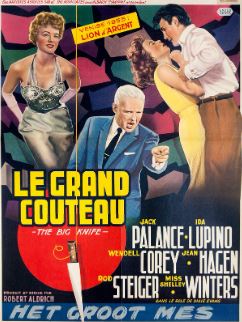 Ce n’est pas du théâtre filmé mais cela n’en est pas loin, seuls les gros plans et les montages personnels d’Aldrich en font du cinéma. C’est John Garfield qui aurait du tenir le rôle de Charlie, c’est dire combien le film aurait été diffèrent car la personnalité de Jack Palance pèse lourd. Avec lui on a toujours l’impression qu’on est proche d’un drame. Ici, dans la jungle hollywoodienne, ce n’est pas lui le plus méchant, Smiley et Stanley sont bien pires…Ils représentent même une sorte de perfection dans le genre puisque ils sont capables d’éliminer physiquement les gêneurs après avoir vainement tenté toutes les fourberies possibles. Le grand couteau est donc un film auxquels ne peuvent porter crédit que les personnes ayant vécus dans ce genre de milieux. Quand on est jeune on refuse heureusement de prendre ce film au sérieux. Aldrich sera moins bavard dans ses films suivants mais à 37 ans, il avait vraiment beaucoup de choses à dire. Un film intéressant par son casting notamment pour Jack Palance qui joue à contre-emploi et qui s'en sort pas mal. il y a Rod Steiger qui en fait beaucoup mais qui est excellent et aussi l'inquiétant Wendell Corey dommage en revanche que Ida Lupino ne soit pas plus utilisée. Malgré tout le film tournée en huis clos à du mal à décoller et le scénario à nous entraîner.