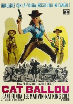 Age aujourd'hui de 87 ans, le réalisateur Elliot Silverstein est surtout connu pour sa carrière de télévision! En 1965, il parvient à rèunir Jane Fonda et Lee Marvin pour ce curieux "Cat Ballou" qui est surtout restè dans les mémoires pour avoir offert un Oscar du meilleur acteur à Marvin! On y voit aussi le chanteur noir Nat King Cole (l'un des plus grands crooners de tous les temps) qui devait mourir peu de temps après le tournage! Nat King Cole et Stubby Kaye incarnent ici deux musiciens ambulants qui chantent une vieille balade de l'Ouest! Cette parodie du western illustre chacun des couplets de la balade avec cette Catherine « Cat » Ballou qui a terminè ses études d'institutrice et qui rentre au ranch paternel! Mais là, son père est menacé par des méchants. « Cat Ballou » va alors se transformer en chef de bande! Jolie rôle pour une Fonda de 27 ans qui se défend comme une diablesse, énergique et rayonnante! Nous sommes dans la chanson de geste, joliment illustrée par de très beaux paysages du Wyoming! Mais le panache du film revient quand même à la double composition de Marvin, sombre tueur à gages au nez d'argent et vieil ivrogne échevelé attachant! Mais de là à lui refiler l'Oscar du meilleur acteur 1965 ? Car sa double composition tient plus à un joyeux festival de cabotinage qu'à THE performance (souvenons nous du Marvin de "The Killers" ou de "Point Blank"). En attendant chantons : « Cat Ballou » , « Cat Ballou » , « Cat Ballouuuu », elle mord, elle griffe, elle vous rend fou! V.F à èviter... Doté d'une réputation incroyable aux Etats-Unis, « Cat Ballou » s'avère avant tout un plaisant divertissement, dynamique et joliment réalisé. Western et comédie font rarement bon ménage : c'est plutôt le cas ici, même si le second l'emporte en définitive largement sur le premier. Cette volonté de ne presque jamais se prendre au sérieux, d'offrir un ton inhabituel à un genre plutôt solennel est agréable à voir, d'autant que certaines situations sont vraiment drôles et les scènes d'action rondement menées. Après, soyons honnêtes : cela n'a rien d'un modèle de subtilité, de finesse et d'analyse psychologique, mais l'œuvre n'en a par ailleurs jamais la prétention. Le tout porté par quelques idées : la narration assurée en chansons par le grand Nat King Cole, ou encore cet incroyable personnage de poivrot tireur d'élite, joué par un Lee Marvin en forme olympique. Et puis il y a Jane Fonda, charismatique et ultra-sexy juste avant sa grande période « féministe », alors... Bref, pas du grand art, mais un western enjoué et surprenant : on aurait tort de s'en priver. Cat Ballou, de Elliot Silverstein, est un western comique présentant la ravissante Jane Fonda dans le rôle d'une institutrice ravagée par la mort de son père et qui décide, du coup, de se rebeller contre le système en organisant un braquage. Accompagnée d'une équipe farfelue (un jeune indien, un pro de la gâchette alcoolique, un hors-la-loi totalement fou d'elle et un homme bien trop souvent déguisé en curé), la blonde aux yeux bleus devra, entre quelques coupures joliment chantées, retrousser ses manches et déjouer le diktat d'un avenir tout tracé. Un western humoristique au ton très léger. Jane Fonda est très pétillante dans la peau de Cat Ballou et Lee Marvin interprète un double rôle. Bizarrement en version française les personnages sont doublés avec un accent américain et même Nat King Cole qui chante la ballade de Cat Ballou. Pas extraordinaire mais amusant à voir. C'est un film de 1965, Cat Ballou est un fermier qui ne veut pas vendre sa terre à des méchants entrepreneurs, le scénario classique du western. Sa fille intervient, une belle blonde, Jane Fonda, c'est elle même qui s'est doublée en français et les autres interprètes ont recopié son accent, ce qui donne au film un aspect bizarre, toutes les personnes ont des accents étrangers. Le film reste moyen et prévisible, un humour grinçant très mitigé.