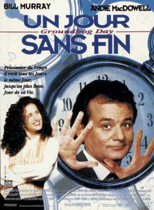 C'est le jour de la marmotte"! Imaginez que la marche du temps s'arrête et vous fasse revivre inlassablement la même journée ? Ces 24 heures deviendraient à la fois un enfer et un incroyable terrain d'expérience où toute limite serait abolie! C'est cette aventure extraordinaire qui arrive à Bill Murray, Monsieur Mètèo cynique et aigri, lorsque, parti filmer une fête locale, il se réveille le matin suivant...le même jour! Coincè dans un méandre de la quatrième dimension, le voilà condamne à vivre à jamais ce satané jour de la Marmotte, sans pouvoir partager son sort avec quiconque! Entre S.F et conte de fèes, Ramis signe une perle romantique et charmeuse, avec l'excellente B.O de George Fenton et le culte "I Got You Babe" de Sonny & Cher... "Un jour sans fin" est une excellente comédie ! Phil Connors, journaliste à la météo, grincheux, égoïste et misanthrope, est contraint de revivre à l'infini la journée de la marmotte. Coincé, on assiste alors à pleins de situations cocasses dont le spectateur est en droit d'attendre. Et c'est alors que Phil Connors (Bill Murray : excellent acteur) profite de cet accident temporel pour tenter de séduire la femme de ses rêves. Qui n'a pas rêvé de revivre la même journée sans conséquence pour agir selon ses désirs : braquer une banque, draguer la fille ( ou l'homme ) de vos rêves, faire un doigt d'honneur à cette fichue société de consommation... Et bien le regretté Harold Ramis a réalisé vis désirs, à la différence que le personnage principal du film est un mec complètement égocentrique et que ces journées vont devenir pour lui un cauchemar. Un jour sans fin est drôle, intelligemment écrit et la romance au milieu se tient. Les acteurs sont excellents, notamment Bill Murray et Andie MacDowell. Une comédie sympa pour passer un bon moment. .Le scénario est vraiment bien écrit , la réalisation et le montage vraiment bon car il nous évite la redondance de revoir a chaque fois le même jour . Même si on revit le même jour on assiste a chaque fois a de nouvelles situations ce qui fait qu'on évite la redondance dans lequel le film aurait pu être piéger . Le film est remplit pour notre plus grand plaisir de scènes cocasse , de situation délirantes et de répliques hilarantes . Un excellent film à la fois drôle, intelligent et touchant. Le grand Bill Muray nous offre un de ses plus beaux rôles, tout comme sa compère à l'écran Andy MacDowell. Cela pourrait être ennuyant et répétitif à la longue mais le scénario est diablement bien tourné. Un grand classique.