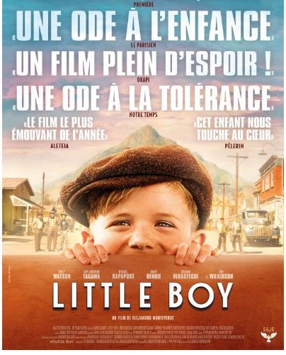 Indéniablement, un charme naïf émane de ce conte initiatique où l'imaginaire côtoie foi, volonté et tolérance. L'amour sans limite entre cet enfant et son fils ainsi que l'amitié entre little boy et "l'ennemi" proposent un récit triste et émouvant, à l'image du final... Little Boy est sorti sur les écrans américains en avril 2015. Deux ans d'attente avant qu'il nous parvienne, donc, une durée qui n'est en général pas des meilleures auspices quant à la qualité du film. Son affiche française n'est pas des plus engageantes non plus, bardée de citations plus laudatives les unes que les autres et extraites de médias tels que Okapi, Notre temps, Pélerin ou Aleteia. Oh, oh, se dit alors le futur spectateur méfiant, s'agit-il ici d'une oeuvre à forte connotation chrétienne ? La vérité est que peut-être mais on peut facilement l'ignorer si l'on n'a pas de goût particulier pour la chose religieuse. Sur l'affiche américaine, l'accroche du film d'Alejandro Monteverde se lisait plus sobrement : Croyez à l'impossible ! Little Boy revendique en effet cette volonté de croire que le pire n'est pas inéluctable même en temps de seconde guerre mondiale. Surtout que le film est vu à travers les yeux d'un enfant, haut comme trois pommes et dont l'environnement semble comme issu d'un conte des frères Grimm. C'est dire que tout n'est pas rose bonbon et le film, plutôt sympathique dans ses aspects magiques et pittoresques, a tendance à trop tirer sur la corde mélodramatique avec force larmes versées. Si la mise en scène ne s'impose pas, réduite à néant par les effets de décorum et de lumière, l'interprétation est d'un niveau acceptable à commencer par celles du Little Boy, Jakob Salvati et de sa mère, la toujours épatante Emily Watson. Les personnages secondaires restent cependant sommairement croqués dans ce film familial sans génie mais sans trop de lourdeur non plus, hormis son orientation lacrymale.