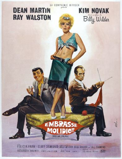 Quel talentueux réalisateur que ce Billy Wilder, ce film regorge de trouvailles visuelles et replace la morale là ou elle devrait être : au fond de nos cœurs. Quelle leçon de sagesse sous couvert de comédie ! Cukor à du être admiratif de ce film, il a du y trouver ce qu’il lui manque parfois lorsqu’il filme les femmes (excepté dans ‘’Voyages avec ma tante’’) : prendre le comique au sérieux afin de leur donner la place qu’elles méritent, la première sur notre planète. Une fois encore le cinéma sort grandi entre les mains de Wilder car si l’on exempte quelques longueurs, quelques rares lourdeurs et une petite réserve sur Dean Martin, ‘’Embrasse moi idiot’’ frôle la perfection. Félicia Farr et Kim Novak sont épatantes et l’idée d’intervertir leurs rôles est parfaitement amenée, leur scène commune dans la roulotte ne s’oublie pas. Barney fait dire dans une chanson ‘’Que serait un médecin sans pharmacien’’…Je dirais bien « Que serait le grand cinéma comique classique sans Billy Wilder ! ». Wilder est le digne successeur de Lubitsch et cette comédie qui ne nous laisse pas une minute de répit le démontre magnifiquement. Le film renverse la morale bien pensante pour notre plus grand plaisir : Ray Waltson vire sa femme pour les besoins d'un plan impliquant Dean Martin et Kim Novak et destiné à promouvoir ses chansons, puis il joue les moralistes en virant Dean Martin qui courtise sa fausse femme (Kim Novak) sous ses yeux mais couche avec cette dernière. Quand à la délicieuse Felicia Farr (qui joue la femme de Ray Waltson) elle s'envoie Dean Martin qui la prend pour une prostituée. Mais à la fin tout finira bien, Novak profitera du prix de la passe de Dean Martin, lequel fera un tube avec la chanson de Ray Waltson qui se réconciliera avec sa femme. C'est magnifiquement réalisé, superbement interprété : Kim Novak est sublime en prostituée et les trois autres acteurs principaux sont parfaits, mention spéciale à Felicia Farr, rayonnante de beauté. La musique est d'André Previn. Chef d’œuvre ’ai découvert Billy Wilder avec le non moins connu « Certains l’aiment chaud ». Embrasse-moi, Idiot est une pure comédie avec ses doses de loufoqueries, de quiproquos et de gags mais reste cependant peu connu du grand public et fut un terrible échec a sa sortie en 1964. Les acteurs sont hilarants notamment Ray Waltson qui a des expressions de visage assez incroyables. Une superbe comédie qui fait vraiment rire. Un film plutôt méconnu dans la carrière de Billy Wilder, mais qui offre cependant un pur moment de comédie. Un véritable régal joué avec brio par le trio Dean Martin, Kim Novak, Ray Walston (exceptionnel !). Wilder sur le plateau s'amuse et le résultat à l'écran est ahurissant, bousculant au passage la censure (nombril d'une femme) et les bonnes moeurs (l'échange des femmes est savoureux !). Un film drôle, enlevé... et intelligent ! Œuvre largement sous-estimée, ce « kiss me stupid » est finalement une des comédies les plus alertes et modernes de Billy Wilder, où il s’adonne avec réjouissance à sa nature de franc-tireur, plus acerbe que jamais dans sa critique de la société américaine (ce qui lui valu une volée de bois vert de la critique à l’époque et un échec en salle). Il faut voir cette docile et sage ménagère se faire prostituée occasionnelle et y trouver son plaisir …et inversement ! Charge virulente contre le puritanisme et le conformisme d’une société sclérosée, le film est aussi une formidable comédie de mœurs, aux rouages savants et à la grâce intacte. Bref, un pur bonheur de cinéma et un des sommets de l’œuvre de Wilder.