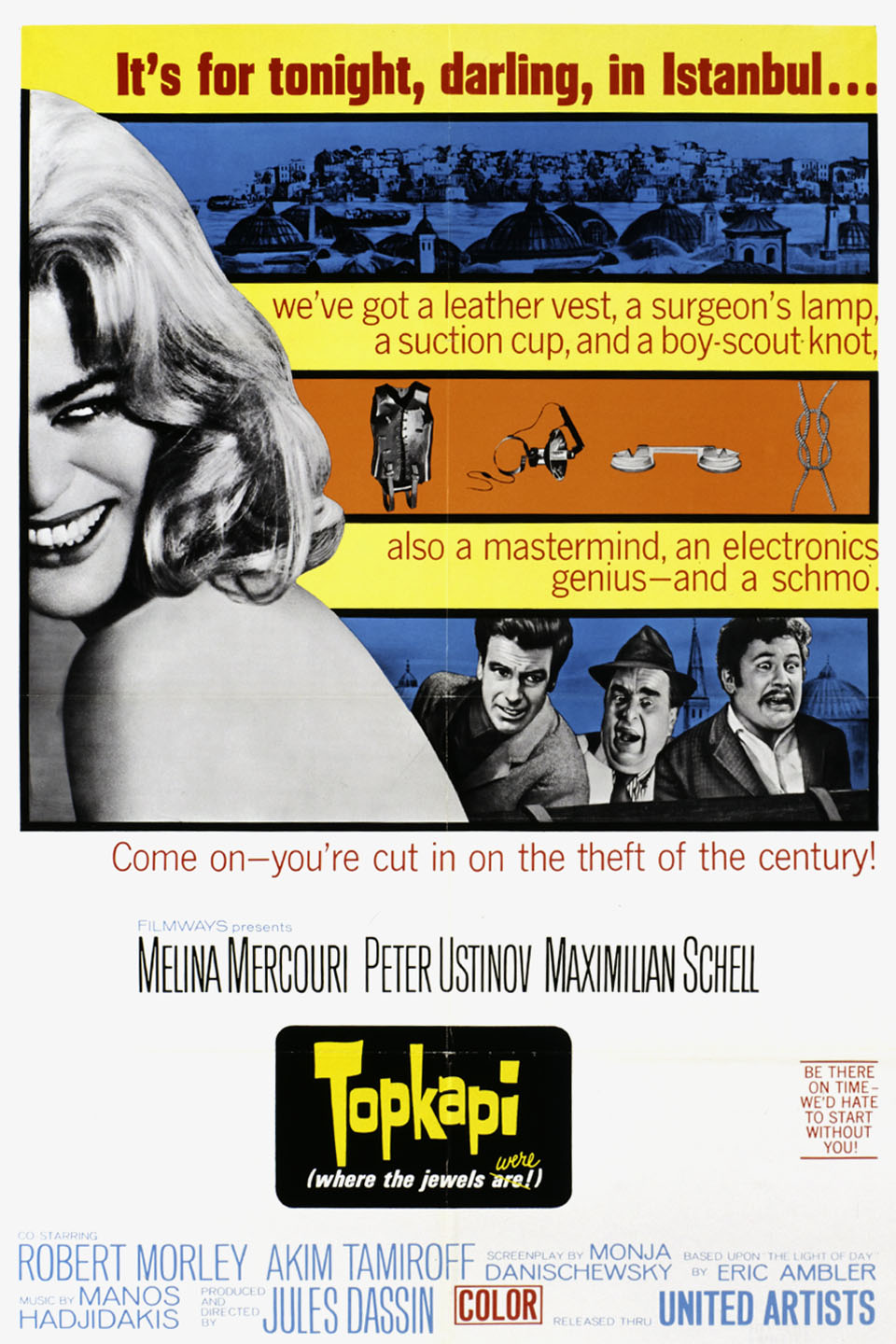 Il ne faut pas croire que les anti-héros n'existaient pas avant Indiana Jones.Au milieu des années 60, Peter Ustinov interpréta le rôle de Arthur Simpson, une sorte d'agent secret cambrioleur ayant le vertige et étant par dessus le marché pleutre à tout les étages.C'est dans "Topkapi" de Jules Dassin qu'Ustinov illumine l'écran dans ce rôle, un film d'aventure à l'exotisme exquis.A ses côtés, on retiendra surtout Melina Mercouri, charmante nymphomane au rire envouteur.Il seront six au total à vouloir dérober une dague d'une valeur inestimable dans le musée de Istanbul, Topkapi.Le film de Dassin est l'archétype du film d'aventure des années 60.Beaucoup d'exotisme, beaucoup de charme et beaucoup d'humour compensent un réel manque de punch et de scènes d'action.Ustinov fait rire, Mercouri charme l'assemblée et le reste de la bande se contente de meubler et même Maximilian Schell qui tient pourtant un des trois rôles principaux, ne parvient pas à convaincre et se fait tout simplement bouffer par les deux autres."Topkapi" est un bon film d'aventure, distrayant et entraînant et c'est tout ce qu'on lui demande. Un superbe casting et des panoramas magnifiques d'Istanbul pour un film qui garde un charme désuet ! Si l'on ne devait retenir qu'une seule séquence de ce chef-d'œuvre, ce serait sans aucun doute le vol de la dague, qui a notamment inspiré Brian de Palma dans Mission:impossible. En effet il s'agit d'une scène extraordinaire sans aucune parole, le spectateur est captivé, il ne peut détacher son regard de l'écran. C'est dans ce genre de scène que l'on voit la force du cinéma que n'a ni le théâtre, ni la littérature. En bref il s'agit d'un film extraordinaire malheureusement peu connu. Une excellente et très divertissante comédie policière avec un scenario très original tout comme sa mise en scène. Le casting est très brillant même si le génial Peter Ustinov vole la vedette à tous ses partenaires. Les décors de carte postale où évoluent les personnages sont magnifiques. Ce film dégage un charme fou.