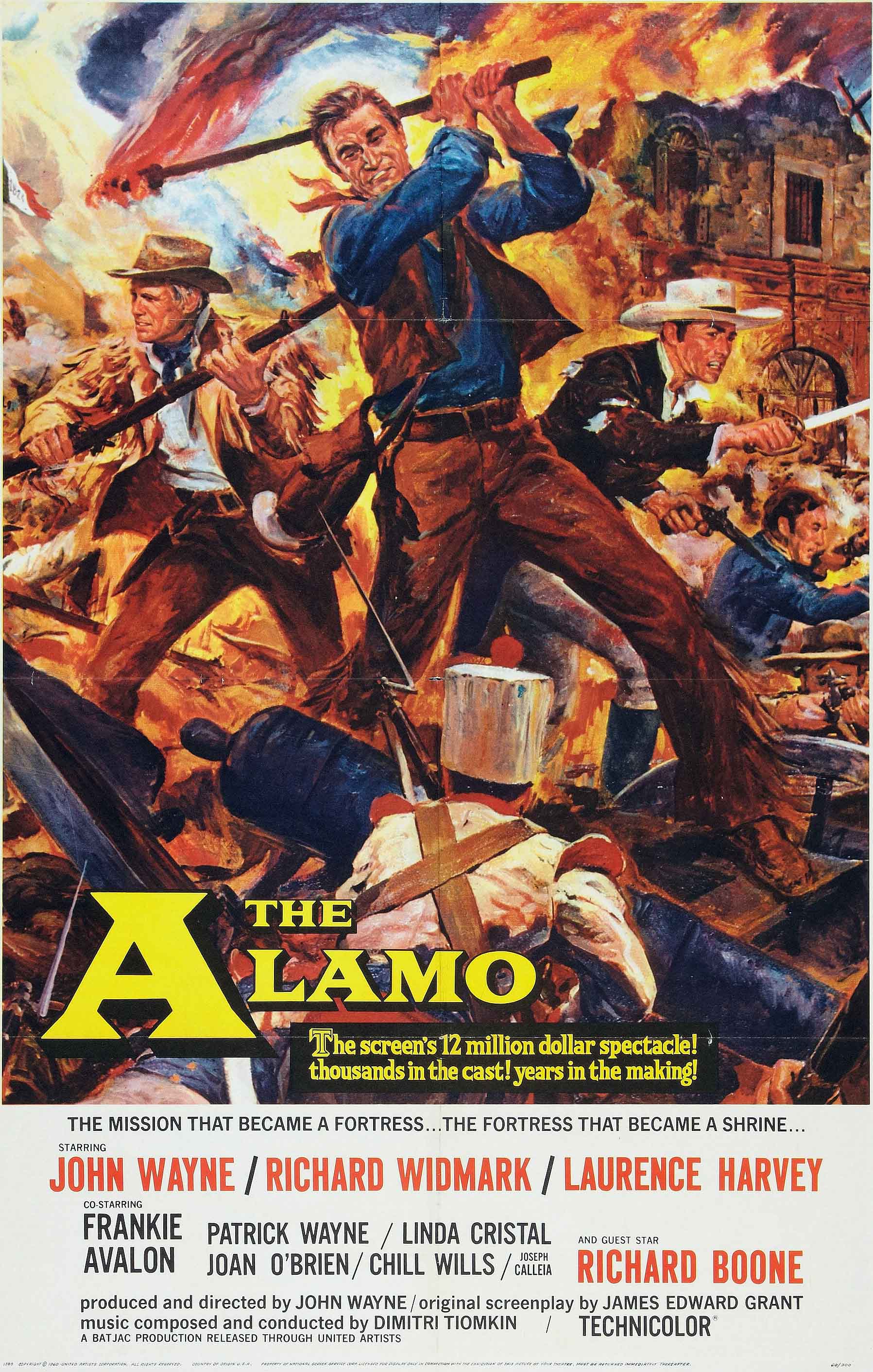 Cette fresque patriotique relatant un épisode de l’histoire du Texas doit énormément à son producteur-réalisateur-acteur John Wayne qui rêvait de ce projet depuis moult années. Il y incarne Davy Crockett, l’un des 187 défenseurs qui résistèrent plusieurs jours durant aux assauts de milliers de soldats mexicains à Fort Alamo. La musique est fort belle et en dépit de quelques rares moments, dont de spectaculaires d’affrontements, ce western n’est que bavardage, synonyme d’un film long, ennuyeux et surestimé. Décors au rabais ( mannequins visibles sur le fort ), scènes de bataille répétées, dialogues de fond de bistrot, morale guerrière au ras des pâquerettes, Bref le duke ne fait que nous présenter à sa bande d'ivrognes ( mais du tennessee ), affligeant ! Le film est vraiment à regarder en deux fois tellement il est long et ennuyeux à mourir par endroits. Une interminable première partie qui doit au final bien durer 2h15 sur les 2h30 du film, et le dernier quart d'heure, une bataille vite expédiée où les Mexicains font (évidemment vu leur nombre) un massacre en bonne règle. Je me demande pourquoi ce film est un classique du genre. Je reste très dubitatif.